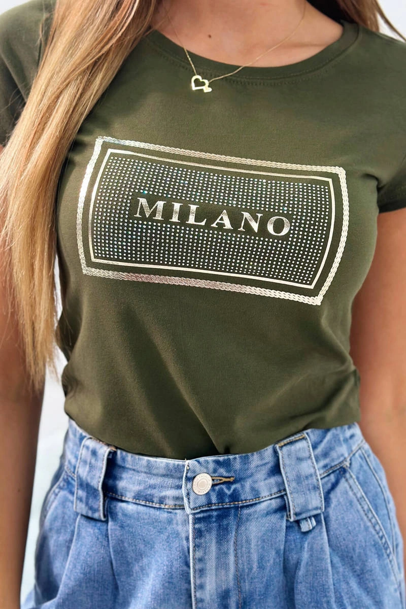 We present you a comfortable blouse with an imprint. Print with the word Milano. Blouse with short sleeves. The blouse is made of high quality material. The size is universal and will be suitable for ladies wearing sizes S, M or L.