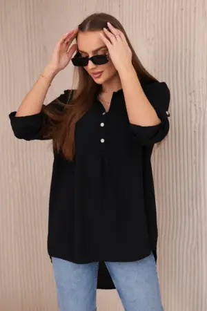 Discover extraordinary elegance and comfort in the presented blouse with a longer back, button neckline and rolled-up sleeves, this blouse not only looks exceptionally stylish, but also provides unrivaled functionality. Feel confident and elegant in a blouse that will emphasize your unique style. Thanks to the longer back, you will create subtle and fashionably irregular proportions, and the button neckline will allow you to adjust the blouse to your preferences. Rolled-up sleeves add lightness and a casual character to the blouse, perfect for various occasions. Whether it’s a business meeting or a relaxing coffee with friends, our blouse will provide you with comfort and style in one. Don’t miss the opportunity to add this unique blouse to your wardrobe! Discover elegance, comfort and functionality in one, and emphasize your unique style today. The size is universal and will be suitable for women wearing size S, M or L.