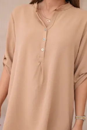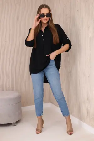 Discover extraordinary elegance and comfort in the presented blouse with a longer back, button neckline and rolled-up sleeves, this blouse not only looks exceptionally stylish, but also provides unrivaled functionality. Feel confident and elegant in a blouse that will emphasize your unique style. Thanks to the longer back, you will create subtle and fashionably irregular proportions, and the button neckline will allow you to adjust the blouse to your preferences. Rolled-up sleeves add lightness and a casual character to the blouse, perfect for various occasions. Whether it’s a business meeting or a relaxing coffee with friends, our blouse will provide you with comfort and style in one. Don’t miss the opportunity to add this unique blouse to your wardrobe! Discover elegance, comfort and functionality in one, and emphasize your unique style today. The size is universal and will be suitable for women wearing size S, M or L.