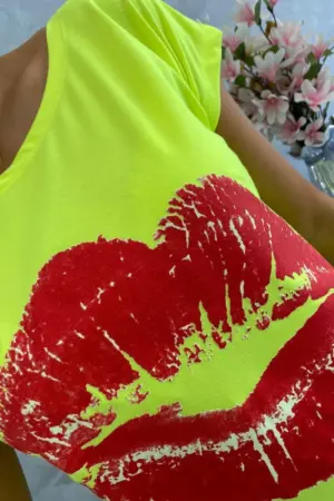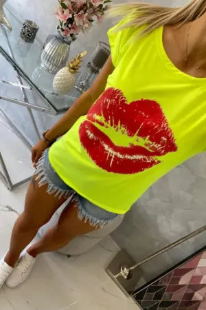 We present you a fashionable blouse. Blouse with lips print Blouse with short sleeves. Cool graphics on a T-shirt. A perfect blouse for shorts. The blouse is made of high quality material. The size is universal and will be suitable for ladies wearing sizes S, M or L.