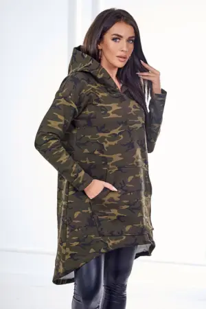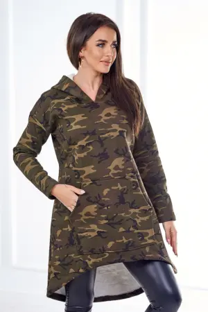 We present you a fashionable camo dress. The dress has a hood and a longer back. A pocket on the front. A dress made of thicker cotton soft to the touch. A perfect proposition for all ladies. The dress is made of high quality material. The size is universal and will be suitable for ladies wearing sizes S, M or L.