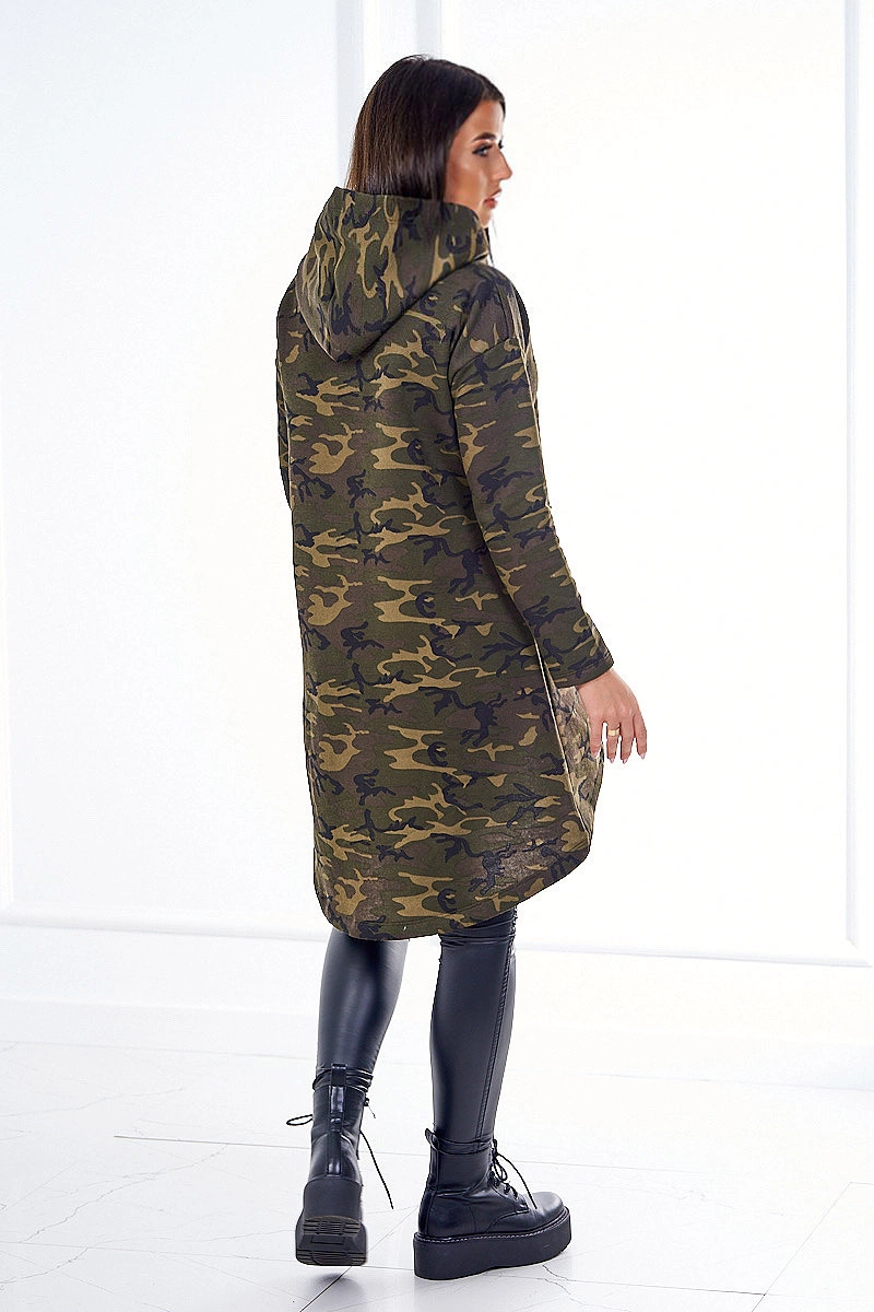 We present you a fashionable camo dress. The dress has a hood and a longer back. A pocket on the front. A dress made of thicker cotton soft to the touch. A perfect proposition for all ladies. The dress is made of high quality material. The size is universal and will be suitable for ladies wearing sizes S, M or L.