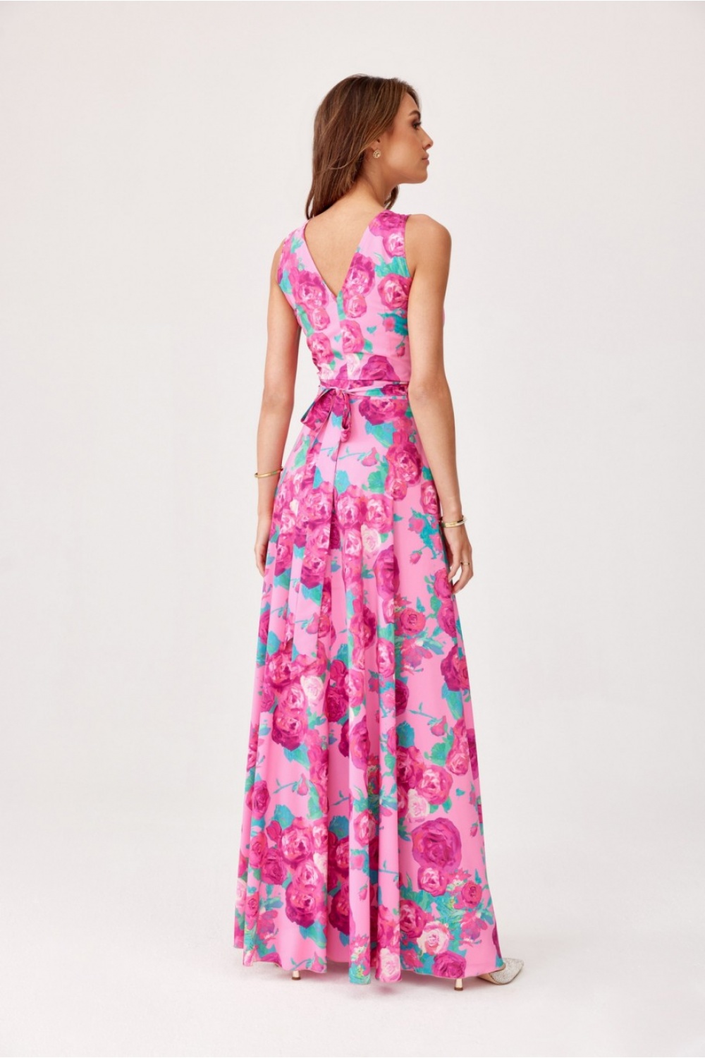 Το φόρεμα είναι διακοσμημένο με ένα φλοράλ μοτίβο, το οποίο προσθέτει μια ελαφριά και λεπτή πινελιά στη συνολική εμφάνιση. Η λαιμόκοψη του φορέματος έχει σχεδιαστεί με επικάλυψη, η οποία κάνει το φόρεμα να φαίνεται πολύ διακριτικό και κομψό. Η κωνικότητα στη μέση δίνει στο φόρεμα ένα θηλυκό σχήμα, ενώ στο πίσω μέρος μεταπίπτει σε έναν δεμένο γοητευτικό φιόγκο. Το φόρεμα δεν έχει φόδρα. Οι χοντρές τιράντες προσδίδουν στο φόρεμα μια λεπτή κομψότητα και μια κλασική αίσθηση. Η φούστα της δημιουργίας είναι επιδέξια πολυεπίπεδη χωρίς να αποκαλύπτει τα πόδια, αλλά το όλο πράγμα κάθεται τέλεια στη σιλουέτα. Το προϊόν κατασκευάζεται και ράβεται στην Πολωνία.