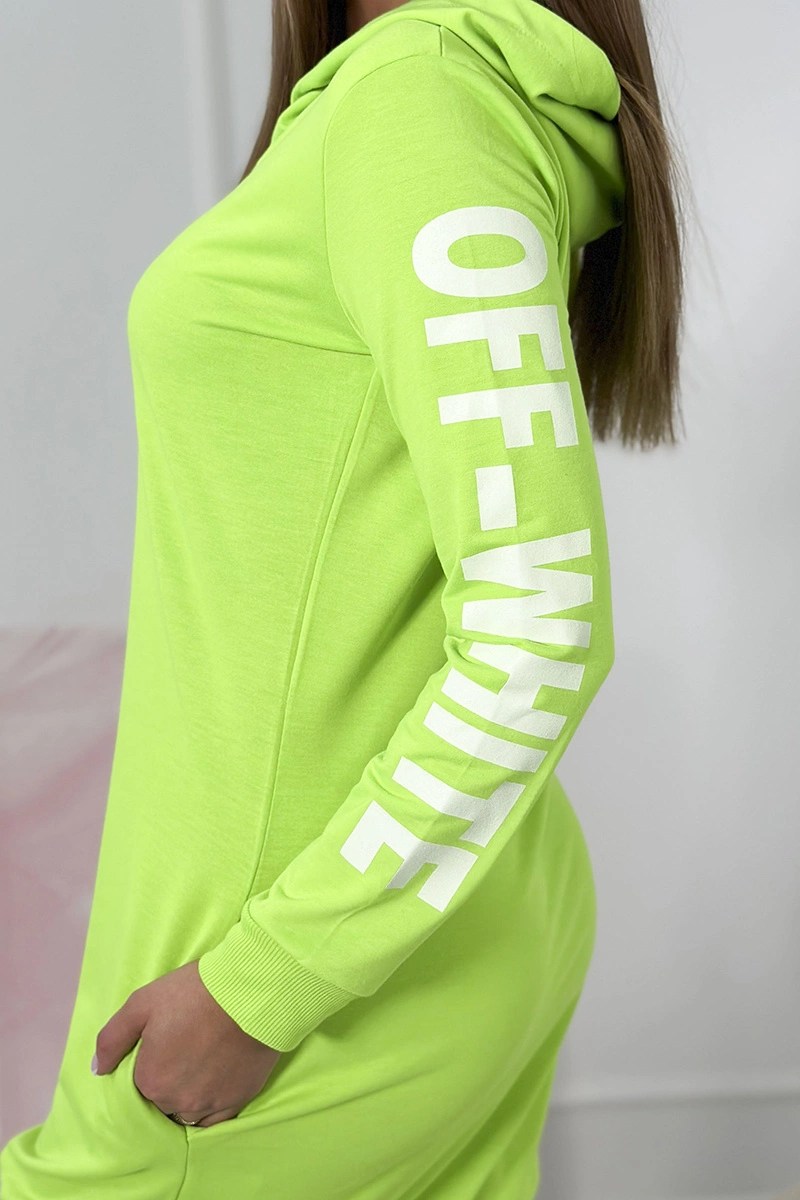 We present you a fashionable dress. Dress with a hood and an inscription on the sleeve off white. The dress has pockets. The dress is made of high quality material. The size is universal and will be suitable for ladies wearing sizes S, M or L.