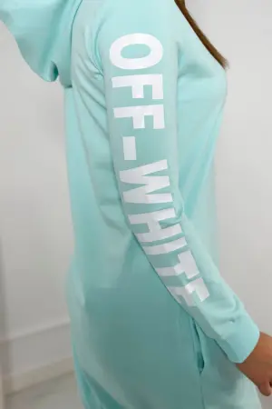 We present you a fashionable dress. Dress with a hood and an inscription on the sleeve off white. The dress has pockets. The dress is made of high quality material. The size is universal and will be suitable for ladies wearing sizes S, M or L.
