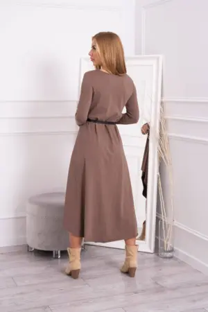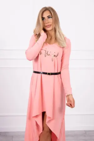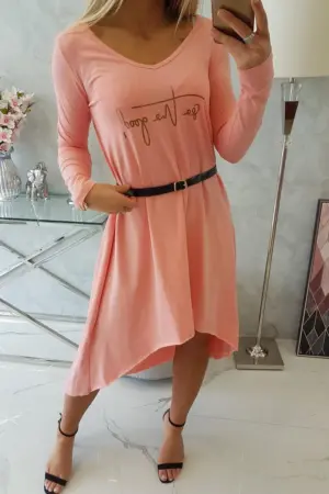 We present you a comfortable dress with a decorative belt and a fashionable inscription on the front. The dress has a longer back. The dress is made of high quality material. A very interesting proposition for all ladies. The size is universal and will be suitable for ladies wearing sizes S, M or L.