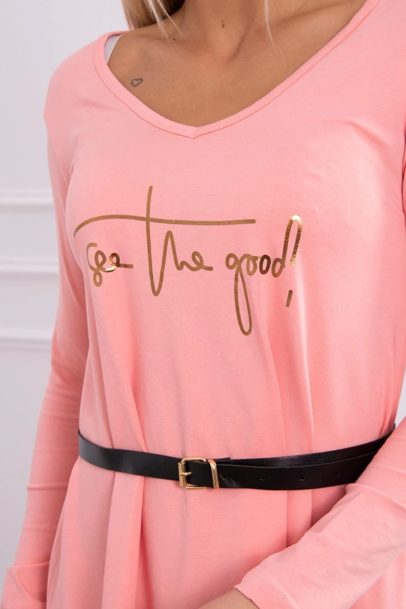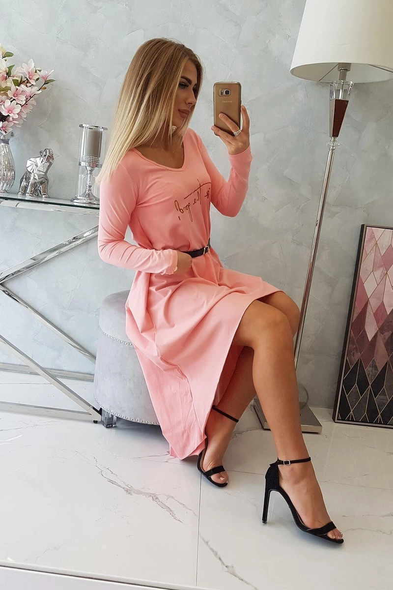 We present you a comfortable dress with a decorative belt and a fashionable inscription on the front. The dress has a longer back. The dress is made of high quality material. A very interesting proposition for all ladies. The size is universal and will be suitable for ladies wearing sizes S, M or L.