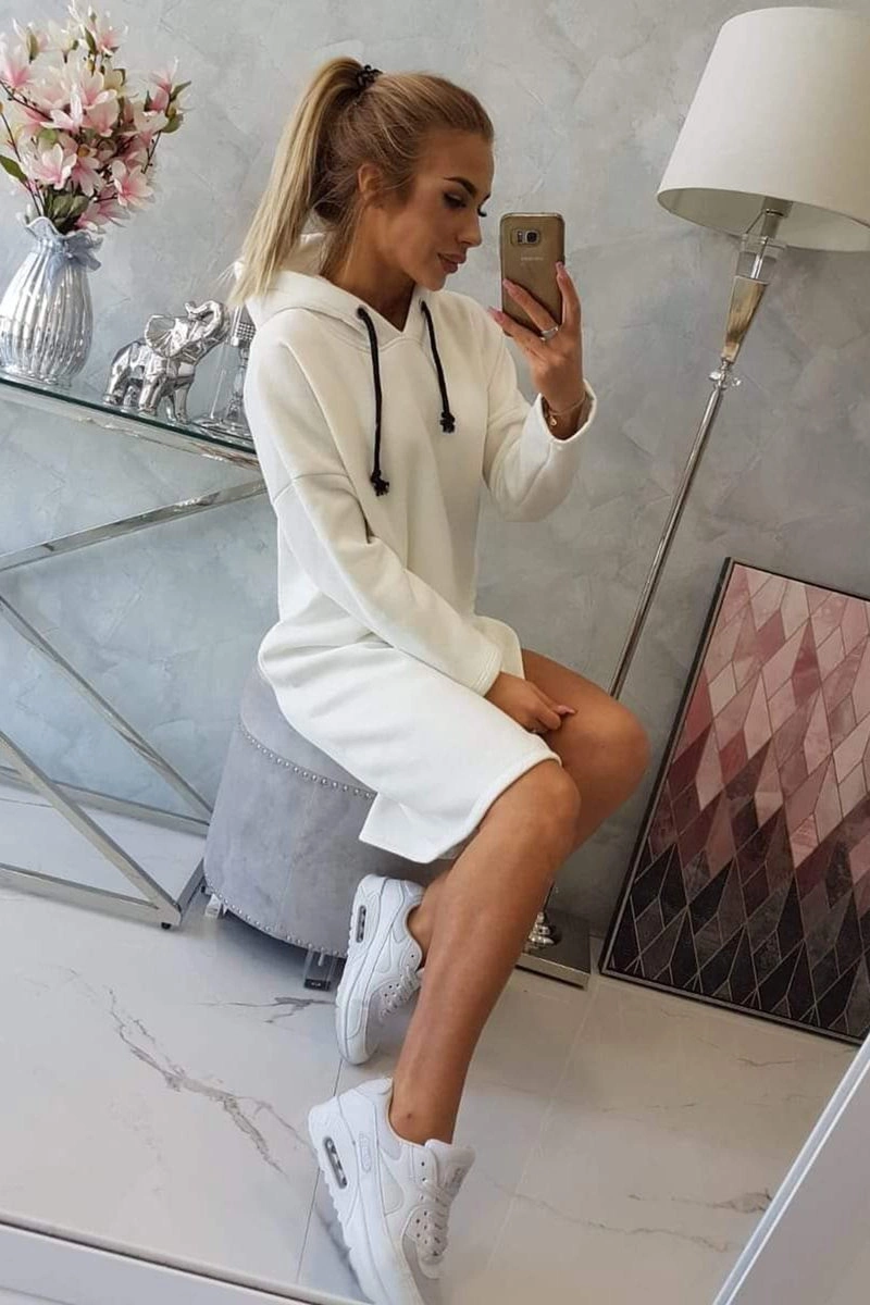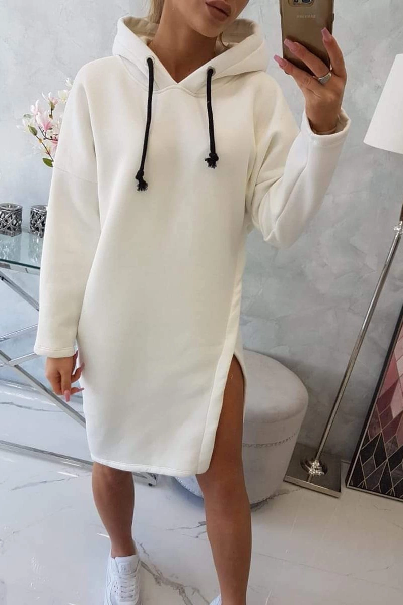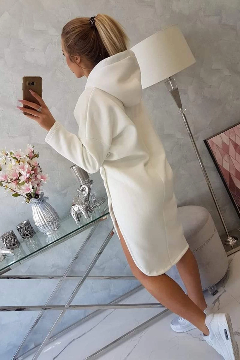 We present you a fashionable dress with a hood. The dress has a longer back and a side slit. A very interesting proposition for each of the ladies. The dress is made of high quality material. The size is universal and will be suitable for ladies wearing sizes S, M or L.