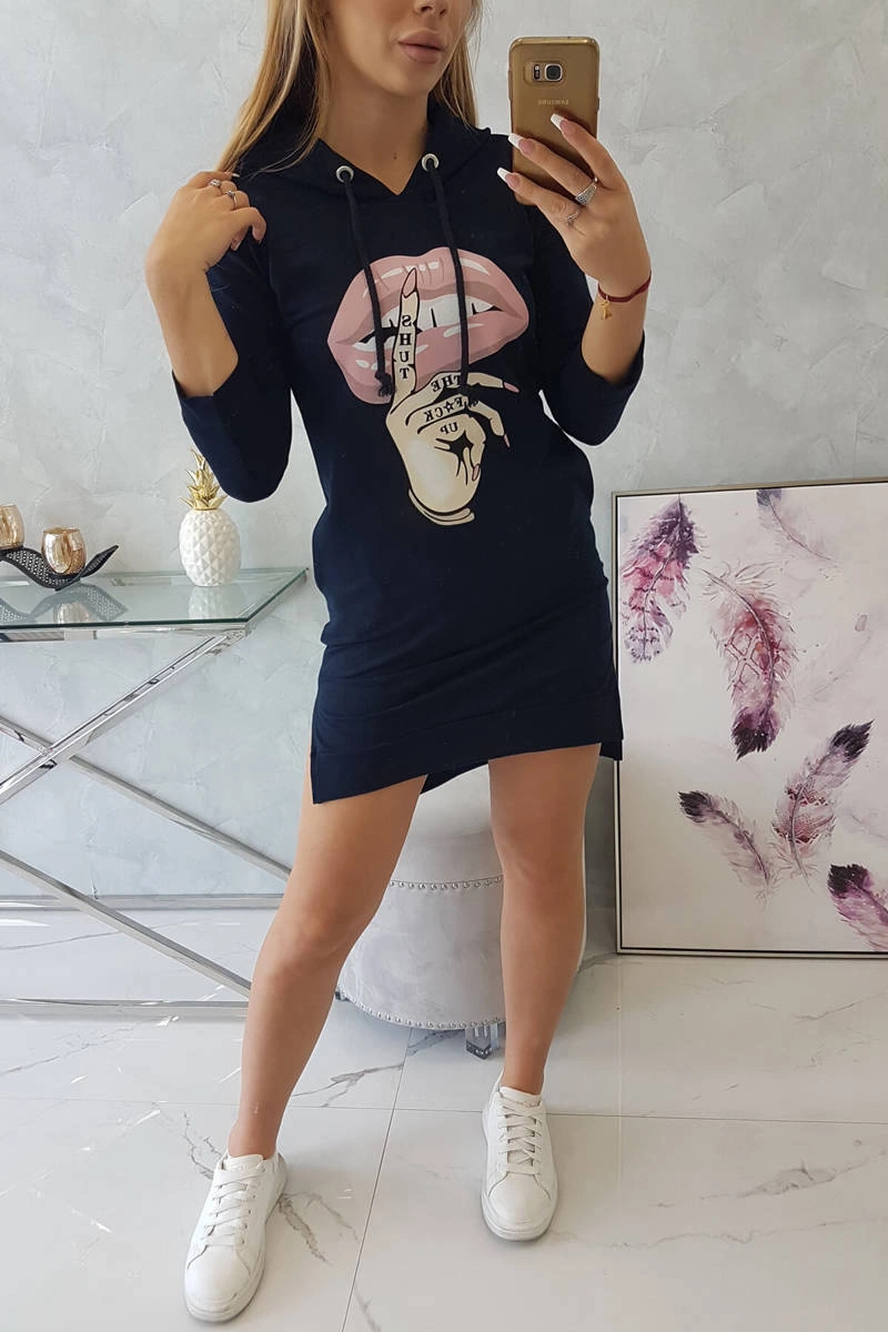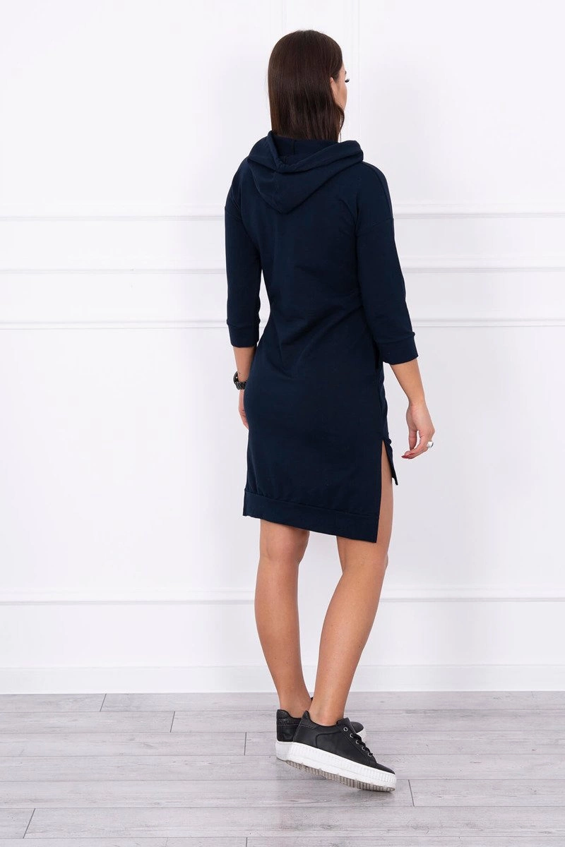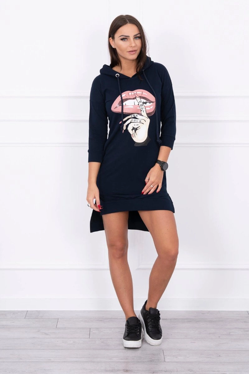 We present you a comfortable dress. Hooded dress, has a fashionable colorful print. Dress with a longer back. Very interesting proposition for all ladies. The dress is made of high quality material. The size is universal and will be suitable for ladies wearing sizes S, M or L.