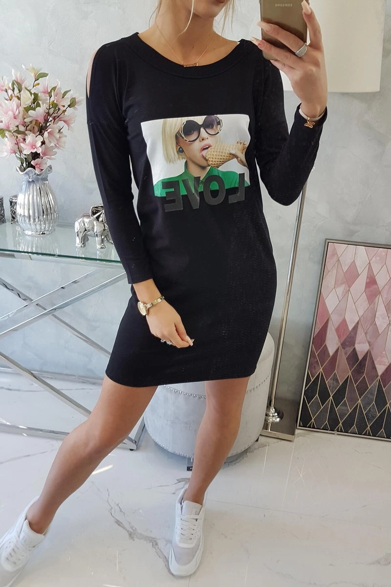 We present you a fashionable dress. The dress has a print. Dress with cut shoulders. An ideal proposition for every day. The dress is made of high quality material. The size is universal and will be suitable for ladies wearing sizes S, M or L.