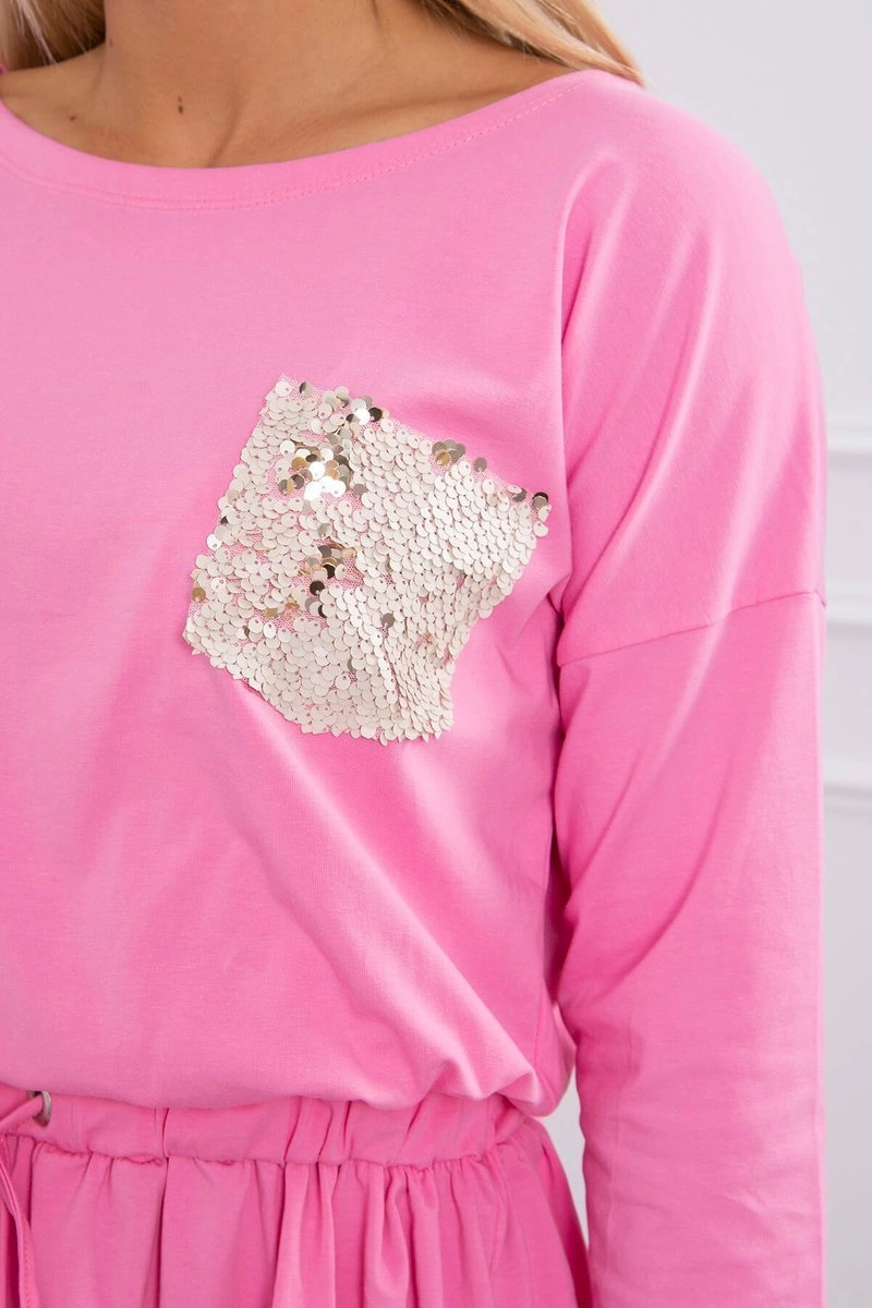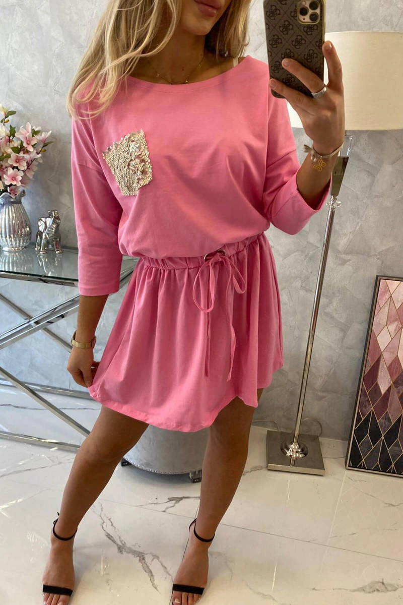 We present you a fashionable dress with a pocket. Pocket covered with sequins. The dress has a tie at the waist. A great proposition for all ladies. The dress is made of high quality material.? The size is universal and will be suitable for ladies wearing sizes S, M or L.