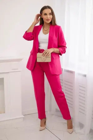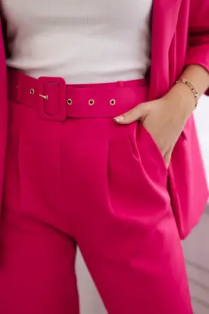 We present you an elegant set of jackets and trousers. Jacket without fastening with front lapels. The jacket has a lining. Trousers with pockets and a belt. There is an elastic band sewn in at the back of the trousers. A very fashionable and stylish set. The set is made of high-quality material. The size is universal and will be suitable for ladies in size S, M or L.