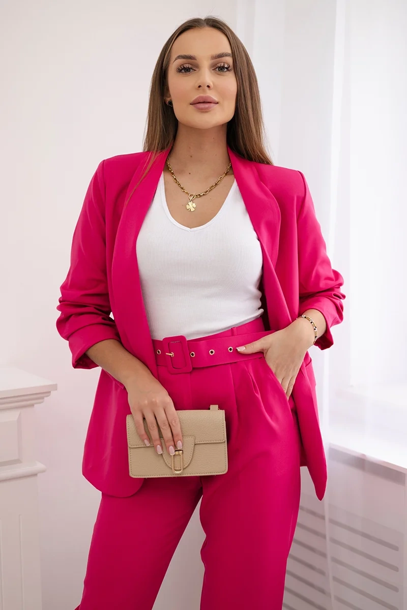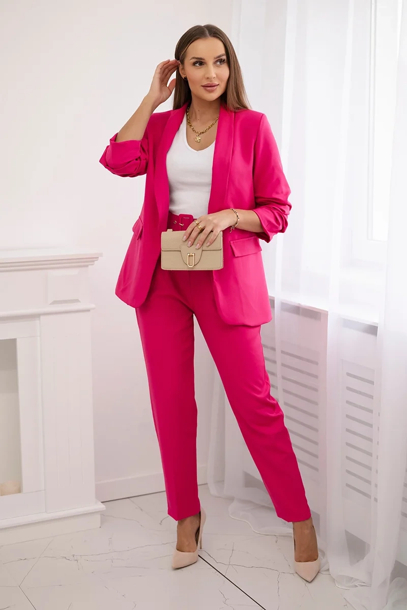 We present you an elegant set of jackets and trousers. Jacket without fastening with front lapels. The jacket has a lining. Trousers with pockets and a belt. There is an elastic band sewn in at the back of the trousers. A very fashionable and stylish set. The set is made of high-quality material. The size is universal and will be suitable for ladies in size S, M or L.