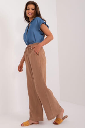 Τα υφασμάτινα παντελόνια είναι ένα βασικό στοιχείο της γκαρνταρόμπας για όσους εκτιμούν την άνεση και το στυλ. Ο casual χαρακτήρας τους τα καθιστά ιδανικά για καθημερινές εξόδους και δραστηριότητες. Κατασκευασμένα από απαλό πολυεστέρα, παρέχουν μέγιστη άνεση για ολοήμερη χρήση. Το ψηλόμεσο παντελόνι αναδεικνύει τη σιλουέτα, ενώ προσφέρει άνετη εφαρμογή. Τα ίσια πόδια κάνουν το παντελόνι να δείχνει κομψό και ευέλικτο, ταιριάζοντας με μια ποικιλία υποδημάτων και αξεσουάρ. Το παντελόνι διαθέτει πλαϊνές τσέπες που μπαίνουν στο παντελόνι, καθιστώντας το πρακτικό και λειτουργικό, επιτρέποντας την άνετη αποθήκευση των απαραίτητων αντικειμένων. Επιπλέον, το δέσιμο στη μέση σας επιτρέπει να προσαρμόσετε το παντελόνι στις προσωπικές σας ανάγκες, εξασφαλίζοντας τέλεια εφαρμογή. Αυτό το υφασμάτινο παντελόνι είναι η τέλεια επιλογή για όσους αναζητούν ένα κομψό αλλά ταυτόχρονα άνετο κομμάτι της καθημερινής γκαρνταρόμπας. Ο λιτός σχεδιασμός και η υψηλή ποιότητα κατασκευής τους τα καθιστούν ιδανική προσθήκη στα καθημερινά σύνολα, προσφέροντας όχι μόνο άνεση αλλά και μια μοντέρνα πινελιά.