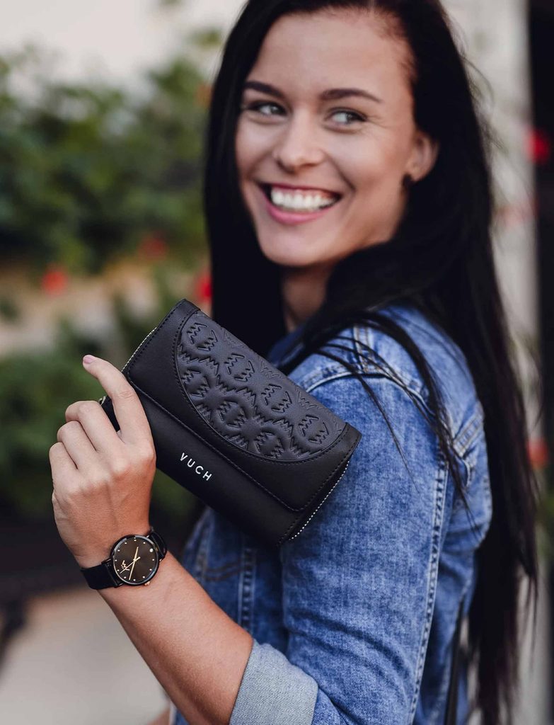 „Elegance, originality and precise workmanship are all associated with the black wallet, which thatnks to its design belongs to the unmissable accessories. Succumb to her magic.“