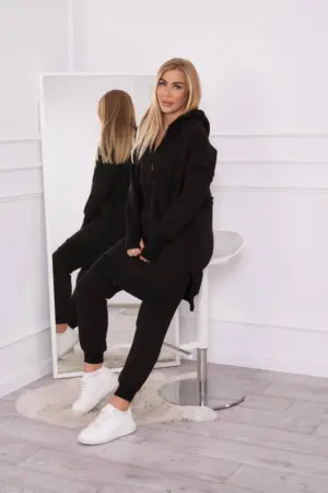 We present you a set of sweatshirts and pants. The sweatshirt has a hood and pockets. Sweatshirt fastened with a zipper, at the bottom on the sides there are slits. The pants have a wide elastic waist and welts at the bottom of the legs. The set is made of insulated material. The size is universal and will be suitable for ladies in sizes S, M or L.
