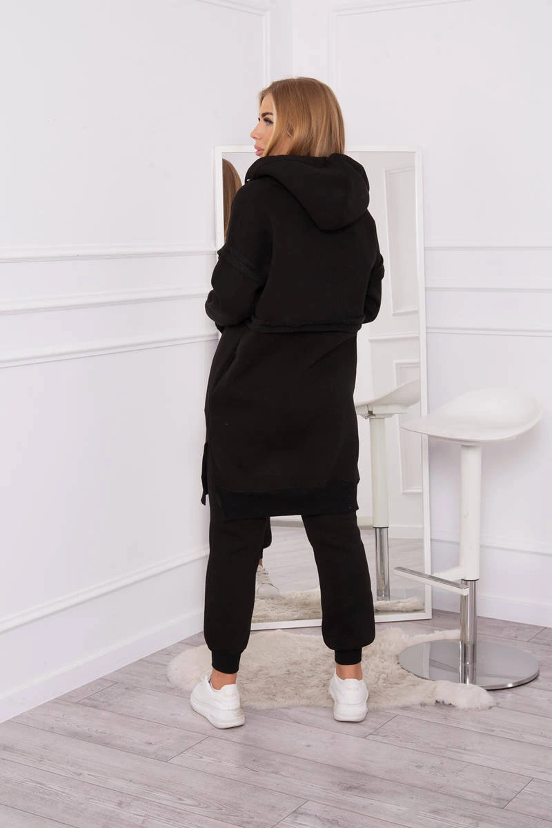 We present you a set of sweatshirts and pants. The sweatshirt has a hood and pockets. Sweatshirt fastened with a zipper, at the bottom on the sides there are slits. The pants have a wide elastic waist and welts at the bottom of the legs. The set is made of insulated material. The size is universal and will be suitable for ladies in sizes S, M or L.
