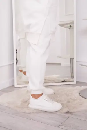 We present you a set of sweatshirts and pants. The sweatshirt has a hood and pockets. Sweatshirt fastened with a zipper, at the bottom on the sides there are slits. The pants have a wide elastic waist and welts at the bottom of the legs. The set is made of insulated material. The size is universal and will be suitable for ladies in sizes S, M or L.