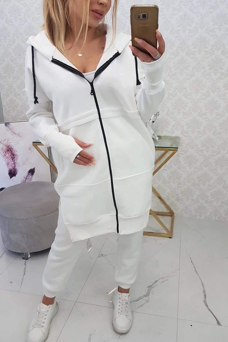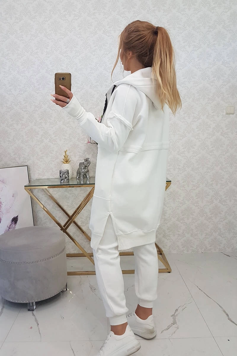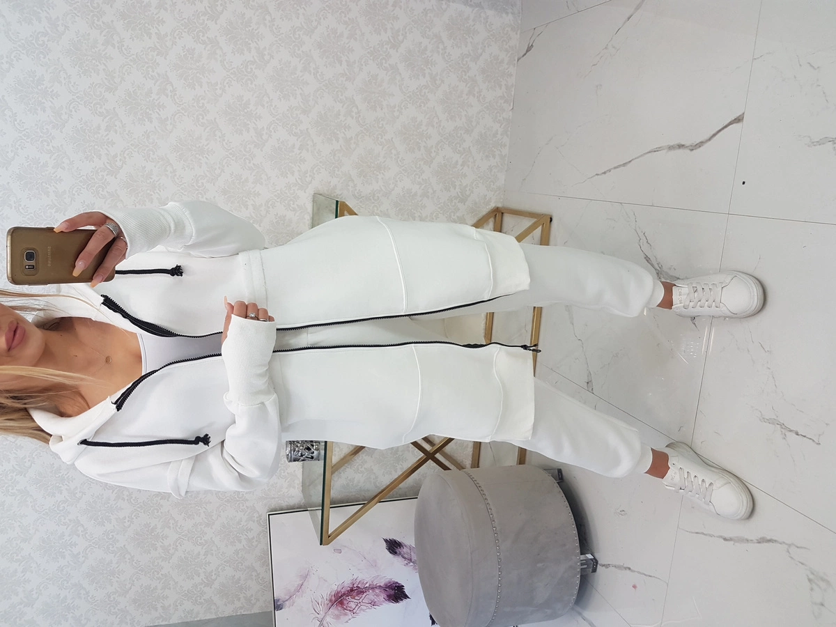 We present you a set of sweatshirts and pants. The sweatshirt has a hood and pockets. Sweatshirt fastened with a zipper, at the bottom on the sides there are slits. The pants have a wide elastic waist and welts at the bottom of the legs. The set is made of insulated material. The size is universal and will be suitable for ladies in sizes S, M or L.