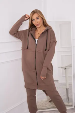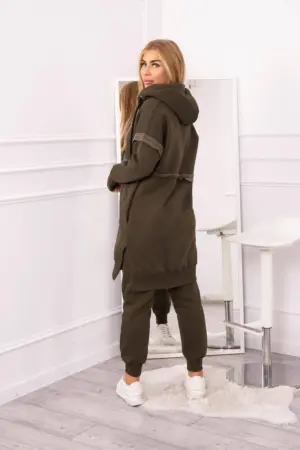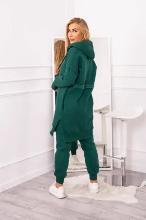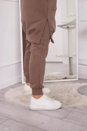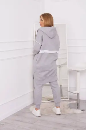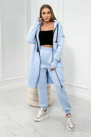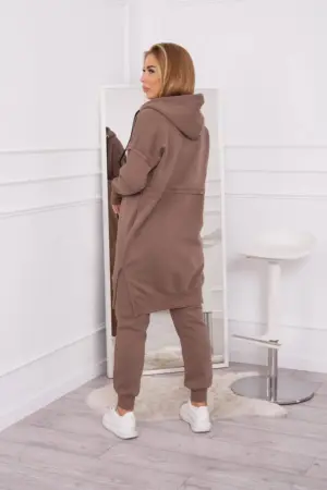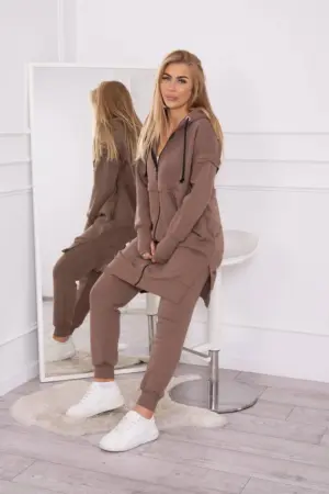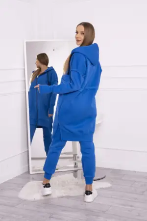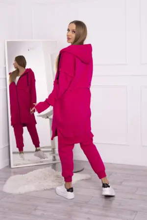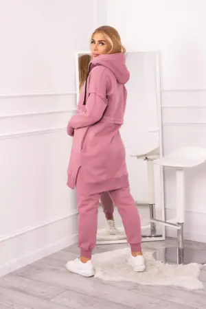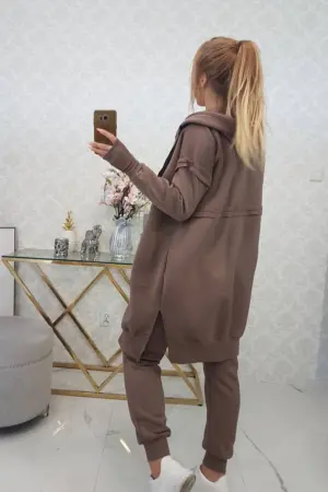 We present you a set of sweatshirts and pants. The sweatshirt has a hood and pockets. Sweatshirt fastened with a zipper, at the bottom on the sides there are slits. The pants have a wide elastic waist and welts at the bottom of the legs. The set is made of insulated material. The size is universal and will be suitable for ladies in sizes S, M or L.