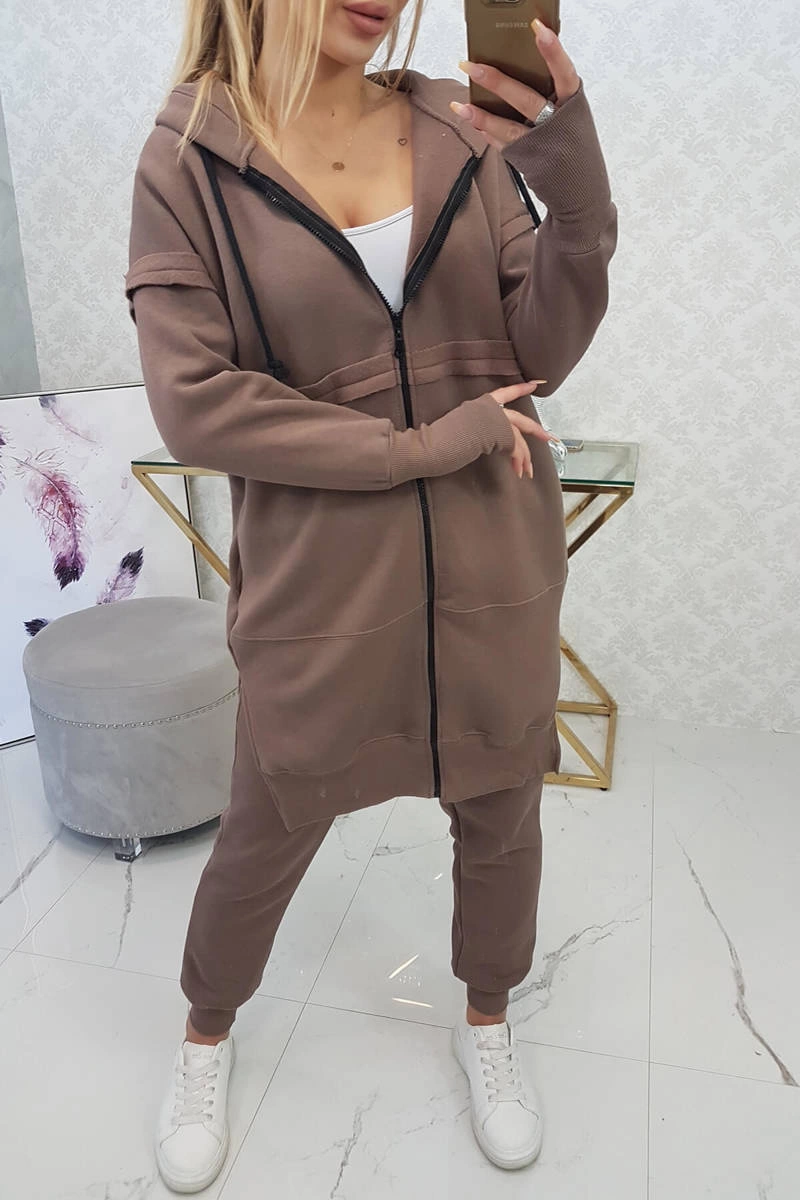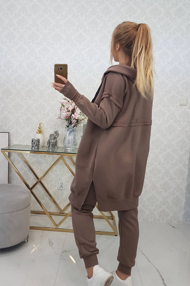 We present you a set of sweatshirts and pants. The sweatshirt has a hood and pockets. Sweatshirt fastened with a zipper, at the bottom on the sides there are slits. The pants have a wide elastic waist and welts at the bottom of the legs. The set is made of insulated material. The size is universal and will be suitable for ladies in sizes S, M or L.