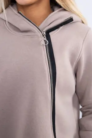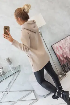 We present you a warm sweatshirt. The sweatshirt has a hood and an asymmetrical zipper. There are two sewn pockets on the front. In addition, the front of the sweatshirt is longer. The sweatshirt is made of insulated material. The size is universal and will be suitable for ladies wearing sizes S, M or L.
