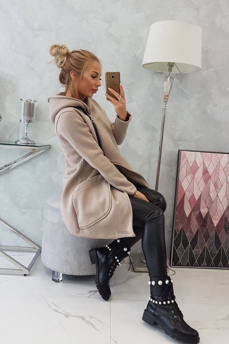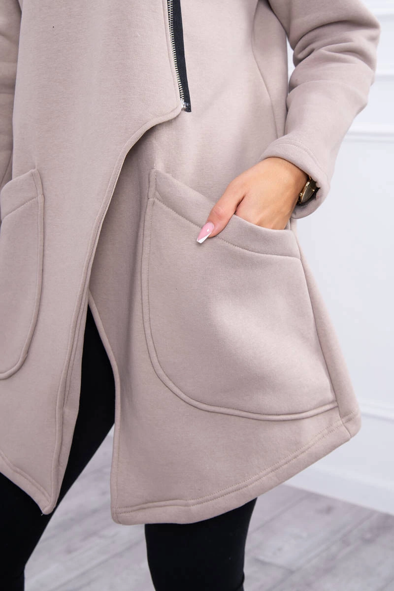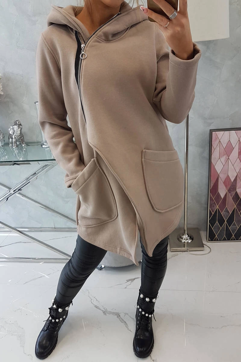 We present you a warm sweatshirt. The sweatshirt has a hood and an asymmetrical zipper. There are two sewn pockets on the front. In addition, the front of the sweatshirt is longer. The sweatshirt is made of insulated material. The size is universal and will be suitable for ladies wearing sizes S, M or L.