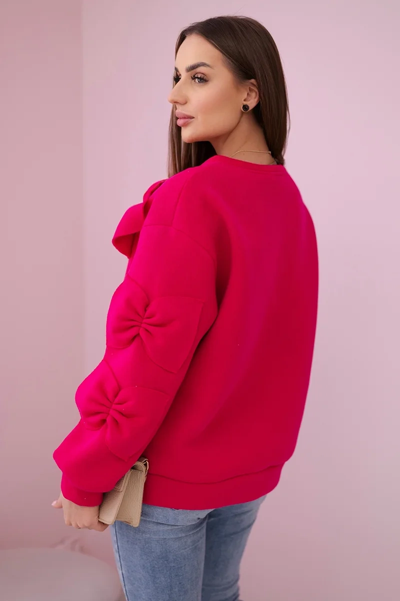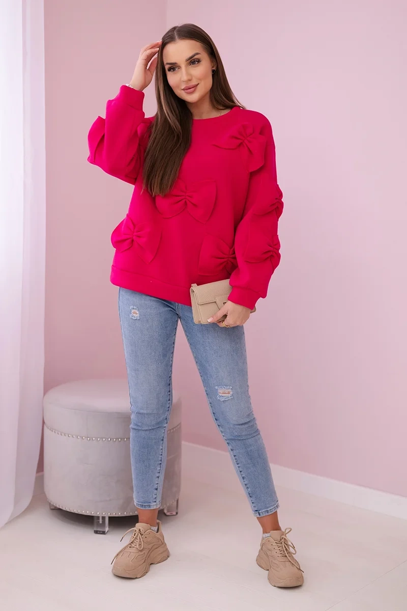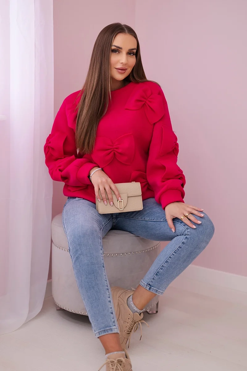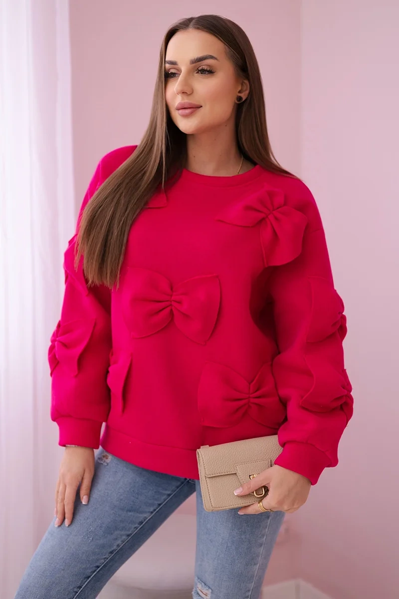 An insulated sweatshirt with decorative bows is a charming and stylish piece of clothing that combines comfort with elegance. Made of warm material, the sweatshirt is the perfect choice for colder days. Additional decorative bows give it originality and girlish charm. The insulated construction of the sweatshirt makes it perfect for autumn and winter days, adding warmth and comfort to your outfit. Bows, placed as decorations, give the sweatshirt a subtle and feminine character, which makes it can be worn both every day and on more special occasions. This piece of clothing perfectly combines practicality with aesthetics, creating a unique and functional outfit. This is a great option for people who value both comfort and stylish details, such as decorative bows. The size is universal and will be suitable for women wearing size S, M or L.