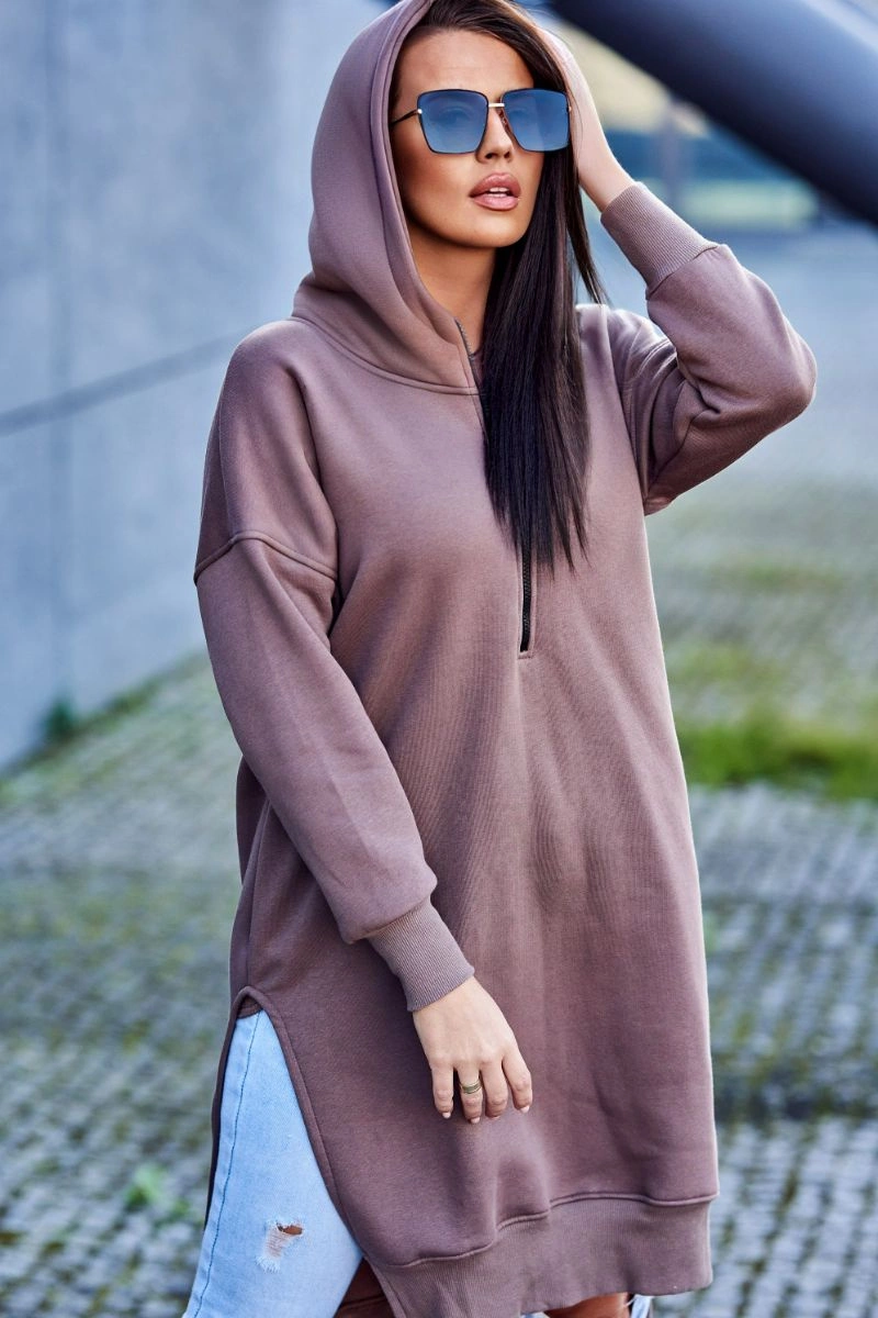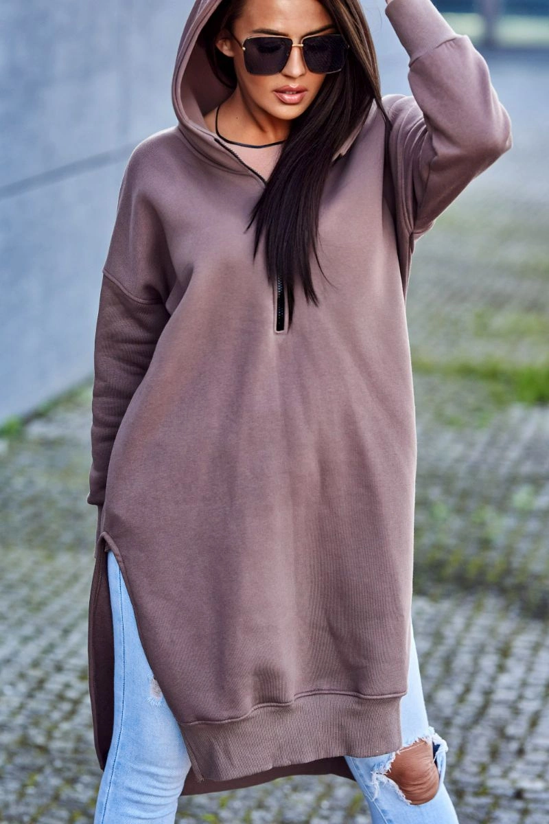 We present you a warm sweatshirt. The sweatshirt has a hood, longer back and a pocket. There are slits on the sides of the sweatshirt, while a sewn-in zipper at the front. The sweatshirt is made of insulated material. The size is universal and will be suitable for ladies wearing sizes S, M or L.