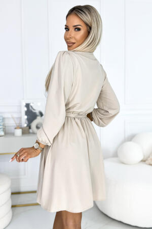 Θηλυκό και κομψό φόρεμα με λαιμόκοψη φάκελο, δέσιμο στη μέση και ελαστικά μανίκια. Φόρεμα σε μπεζ χρώμα. Πολωνική παραγωγή. Μάρκα numoco.