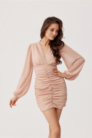 Αυτό το μοναδικό μίνι φόρεμα είναι σίγουρο ότι θα τραβήξει την προσοχή σε κάθε περίσταση. Το πάνω μέρος του φορέματος διαθέτει μια επικαλυπτόμενη λαιμόκοψη V, η οποία τονίζει επίσης απαλά την πλάτη. Τα μακριά μανίκια με μπούστο, τα οποία προσθέτουν μια πινελιά φινέτσας και κομψότητας, τελειώνουν με λάστιχο. Το κόψιμο κάτω από το μπούστο τονίζει και λεπταίνει τη μέση, ενώ το ντραπέ τονίζει τη σιλουέτα. Το κάτω μέρος του φορέματος είναι μια εφαρμοστή φούστα που χαρακτηρίζεται από μια μοντέρνα πτυχή. Το μήκος της φτάνει πάνω από τα γόνατα και οι πτυχώσεις προσδίδουν λεπτότητα και διακριτικότητα. Ολόκληρο το φόρεμα κλείνει με καλυμμένο φερμουάρ στο πίσω μέρος του φορέματος, καθιστώντας το εύκολο στη χρήση. Το φόρεμα Sarah διαθέτει επένδυση. Αυτό το μοντέλο φορέματος είναι μια εξαιρετική επιλογή ως ολοκληρωμένο ντύσιμο που είναι ιδανικό για διάφορες γιορτές. Το προϊόν κατασκευάζεται και ράβεται στην Πολωνία.