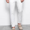 - Gently tapered, raw-edged leg