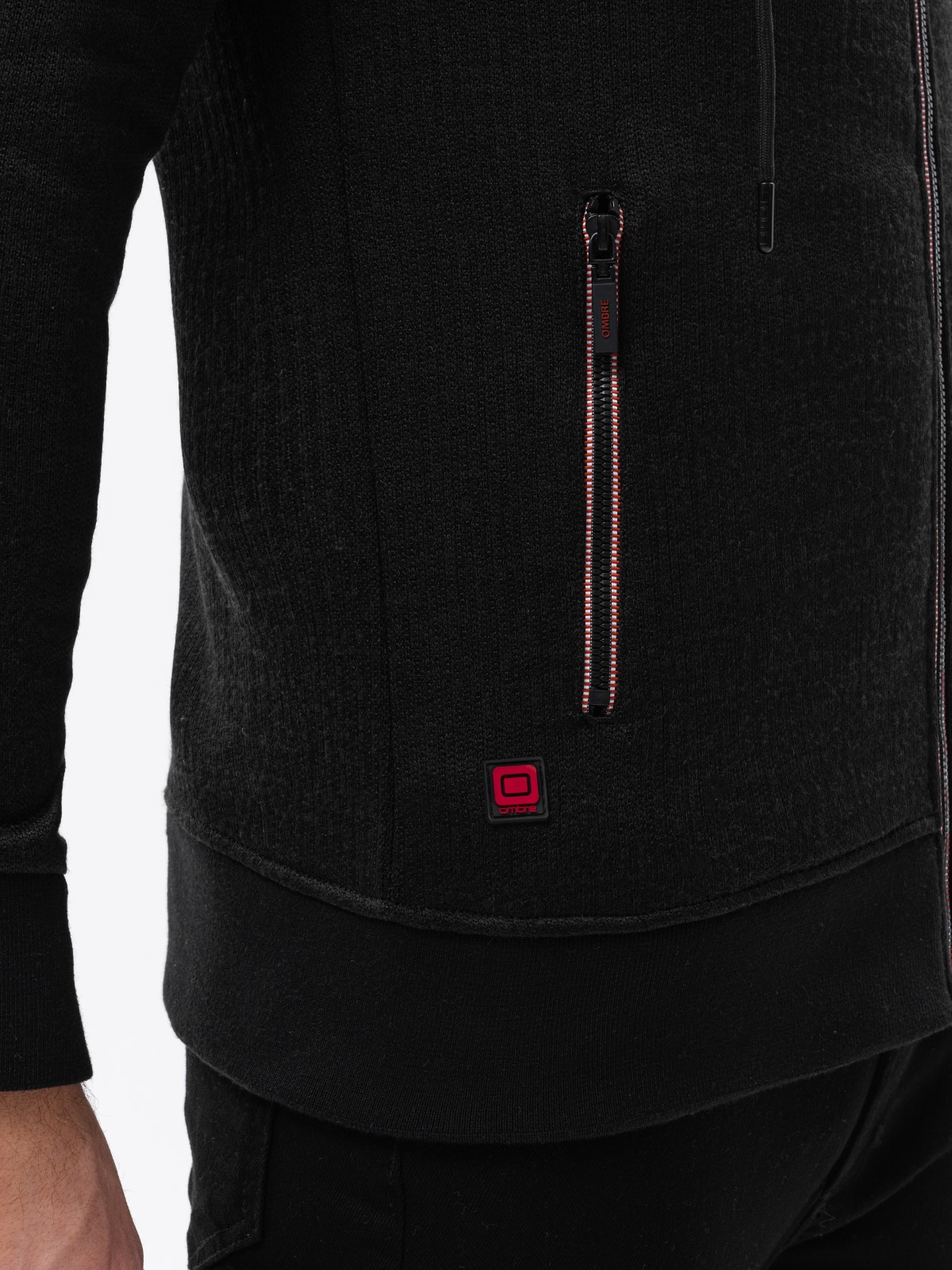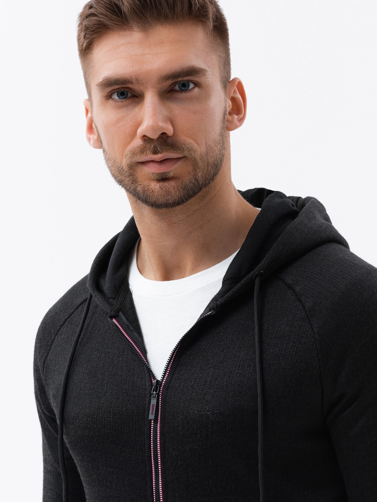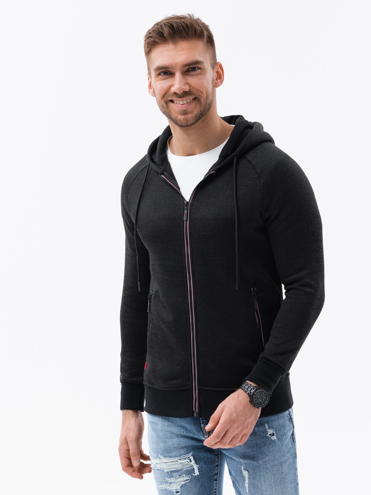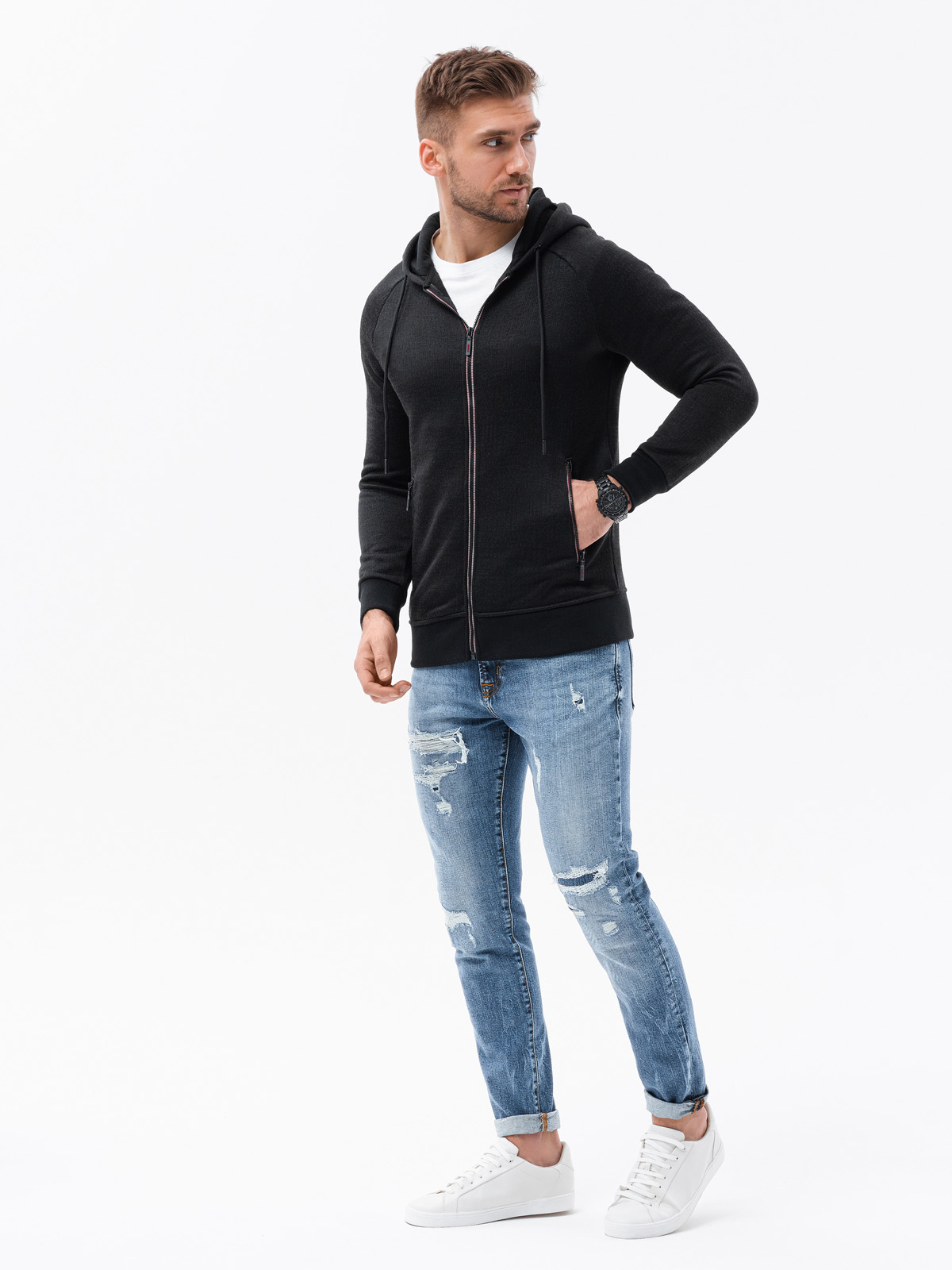 The model presents the product in size: M