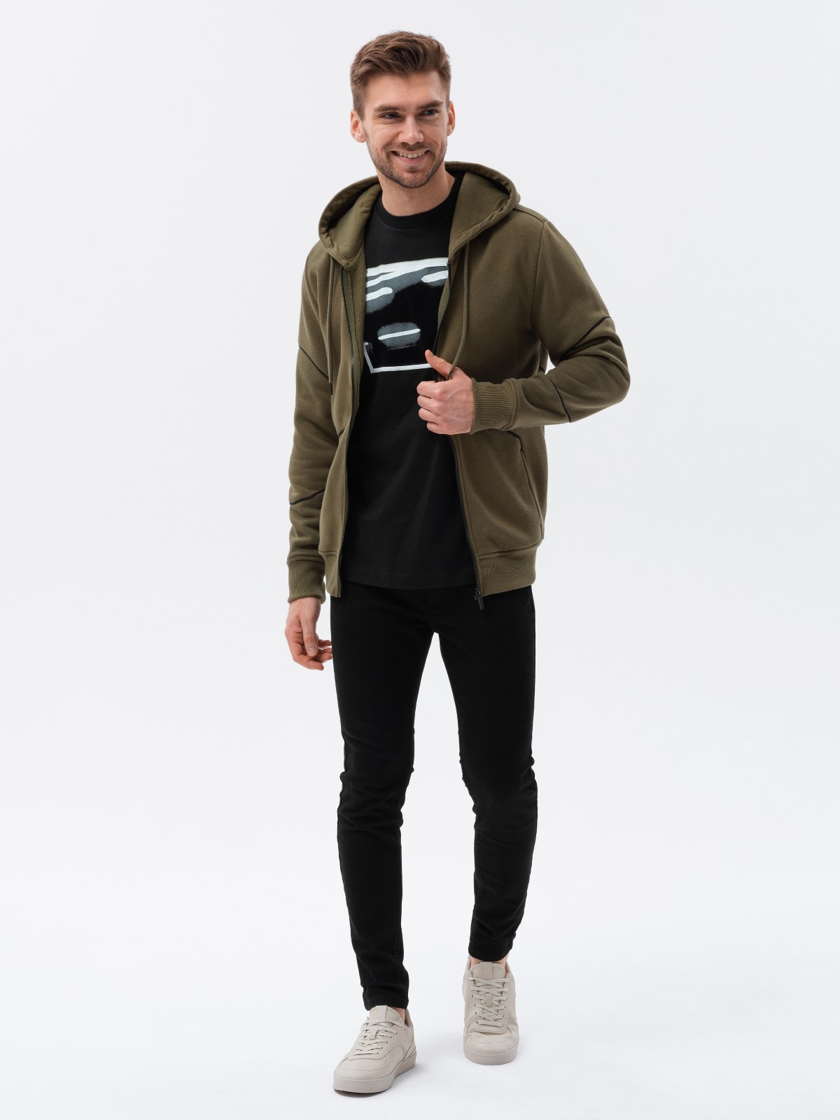 - The model presents the product in size: M