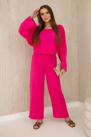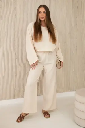 The muslin blouse + trousers set is the perfect combination of elegance and lightness, which will make you feel both stylish and comfortable in any situation. Made of delicate and airy muslin material, this set will keep you feeling comfortable and fresh all day long. The blouse from this set is characterized by a light and loose cut, which is perfect for summer days. Its subtle design and delicate finishes add elegance, allowing it to be easily combined with various wardrobe items. Muslin trousers are the perfect addition to the set, providing comfort and style in one. Their light and airy material makes them perfect for summer walks or evening outings. Wide legs add character and make them look exceptionally impressive. A muslin set is a perfect choice for women who value comfort and elegance in everyday clothing. Thanks to its light and airy material and universal design, this set will perfectly match various occasions and styles. The size is universal and fits women wearing size S, M or L.