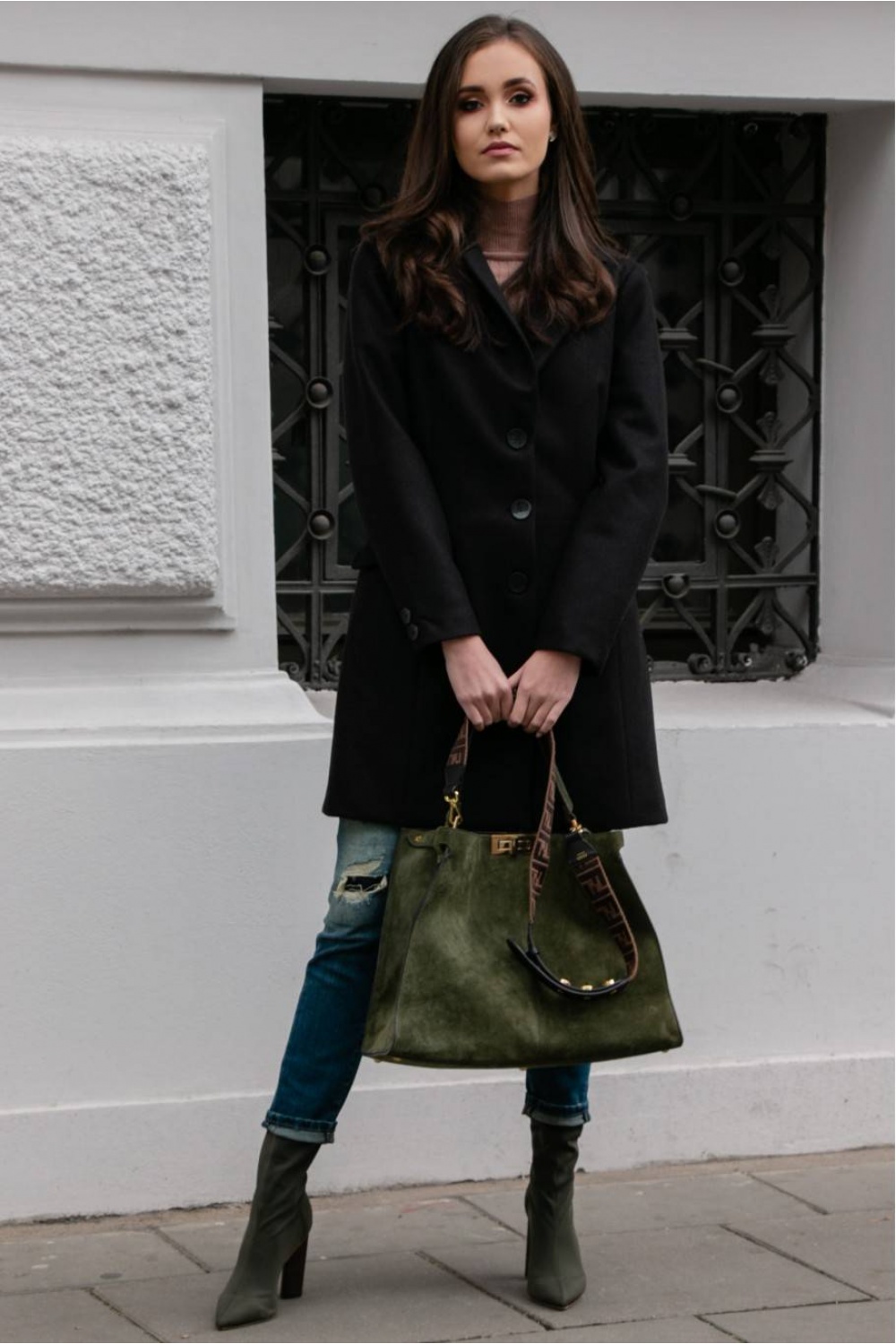 Μονόπετο παλτό με εφαρμοστό κόψιμο. Κλείσιμο με τρία κουμπιά και κλασικό γιακά. Διαθέτει επένδυση, πρακτικές τσέπες και διακοσμητικά στοιχεία με τη μορφή κουμπιών στα μανίκια. Πολωνική παραγωγή.