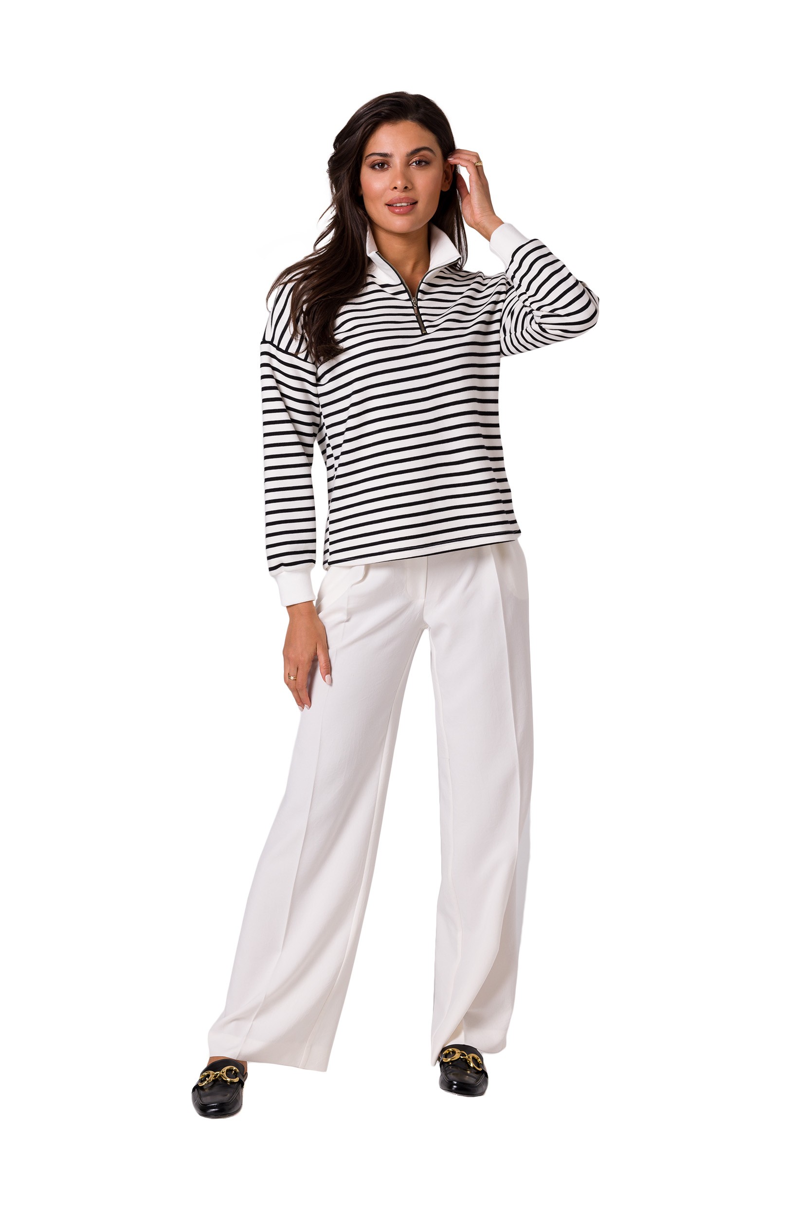 Άνετο φούτερ με ψηλό γιακά και φερμουάρ, για τις πιο δροσερές ανοιξιάτικες και καλοκαιρινές ημέρες, από ριγέ βαμβακερή πλεκτή ύφανση.