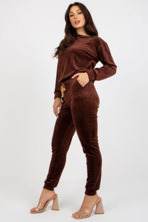 Σετ από βελούδο που αποτελείται από μπλούζα και παντελόνι. Μπλούζα με μακριά μανίκια και στρογγυλή λαιμόκοψη. Μακρύ παντελόνι με γραβάτα στη μέση και τσέπες.