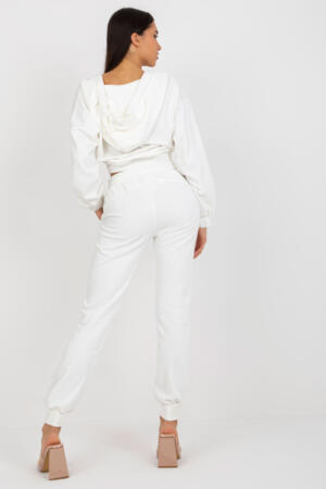 Σετ φόρμας που αποτελείται από φούτερ και παντελόνι. Κοντό φούτερ με μακριά μανίκια, κουκούλα και λαιμόκοψη φάκελο. Μακρύ παντελόνι με γραβάτα στη μέση και τσέπες με τρυπούλες.