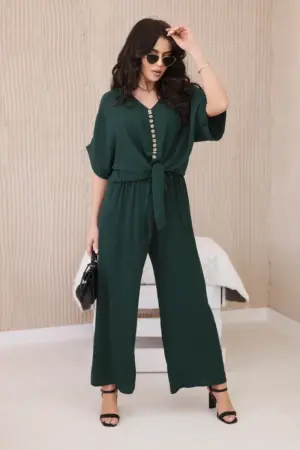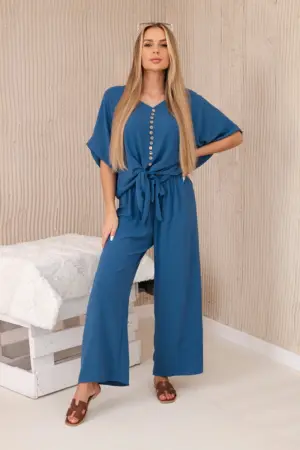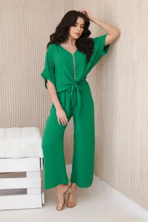 Italian set with a front-tied blouse and wide-leg pants is an ideal choice for women who value comfort and style in one. The blouse tied with buttons at the front adds subtle femininity. The wide-leg pants, made of soft and pleasant-to-touch material, provide freedom of movement and comfort while wearing. This complete set can be worn on various occasions – both to work, as well as on dates or meetings with friends. Combined with elegant shoes and accessories, such as a purse or jewelry, it creates a stylish and fashionable outfit. The size is universal and will be suitable for women in sizes S, M, or L.