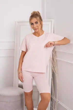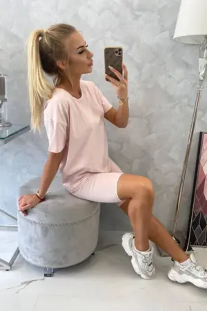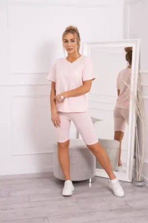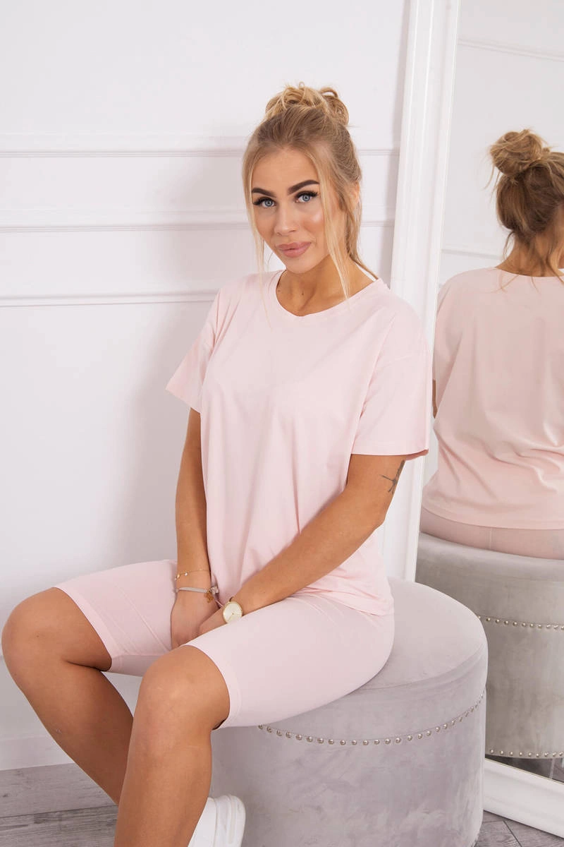 We present you a set of blouses and pants. Smooth blouse without printing leggings have a short leg. The set is made of high quality material. The size is universal and will be suitable for ladies wearing sizes S, M or L.