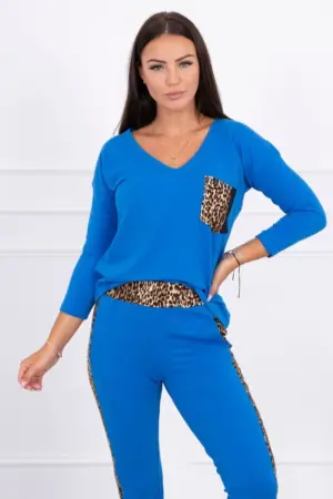 We present you a set of blouses and pants. The set has inserts with a leopard motif. Blouse at the front with a sewn-in pocket. The pants have pockets. The set is made of high quality material. The size is universal and will be suitable for ladies wearing sizes S, M or L.
