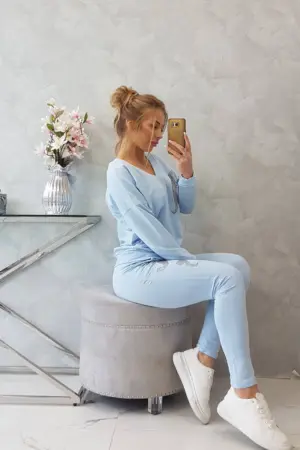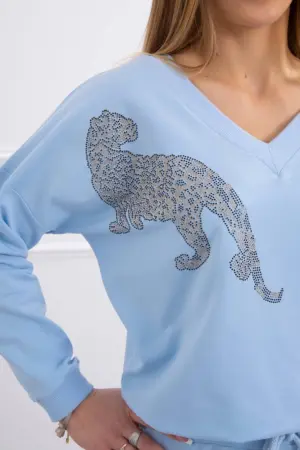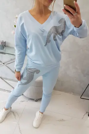 We present you a set of sweatshirts and pants. The sweatshirt and pants have a zircon panther. Pants with pockets and a binding at the waist. V-neck sweatshirt. The set is made of high quality material. The size is universal and will be suitable for ladies in sizes S, M or L.