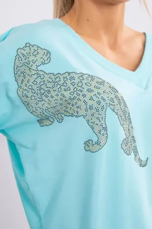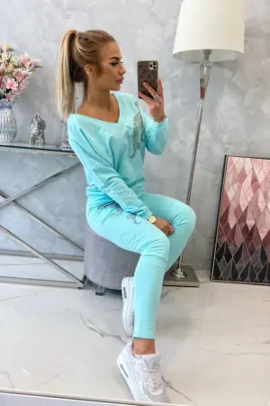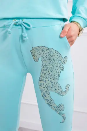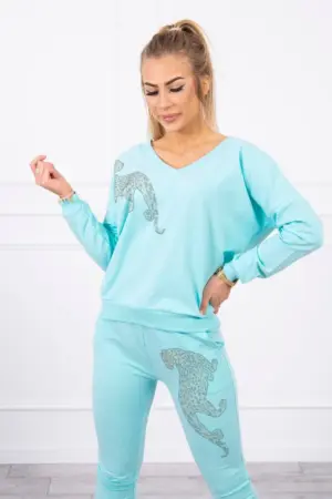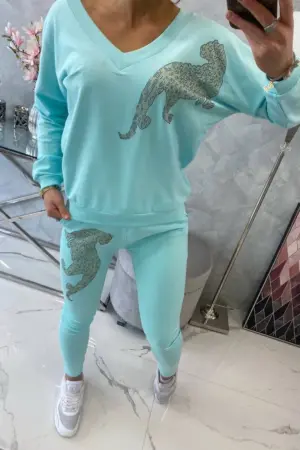 We present you a set of sweatshirts and pants. The sweatshirt and pants have a zircon panther. Pants with pockets and a binding at the waist. V-neck sweatshirt. The set is made of high quality material. The size is universal and will be suitable for ladies in sizes S, M or L.