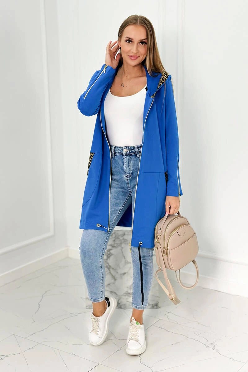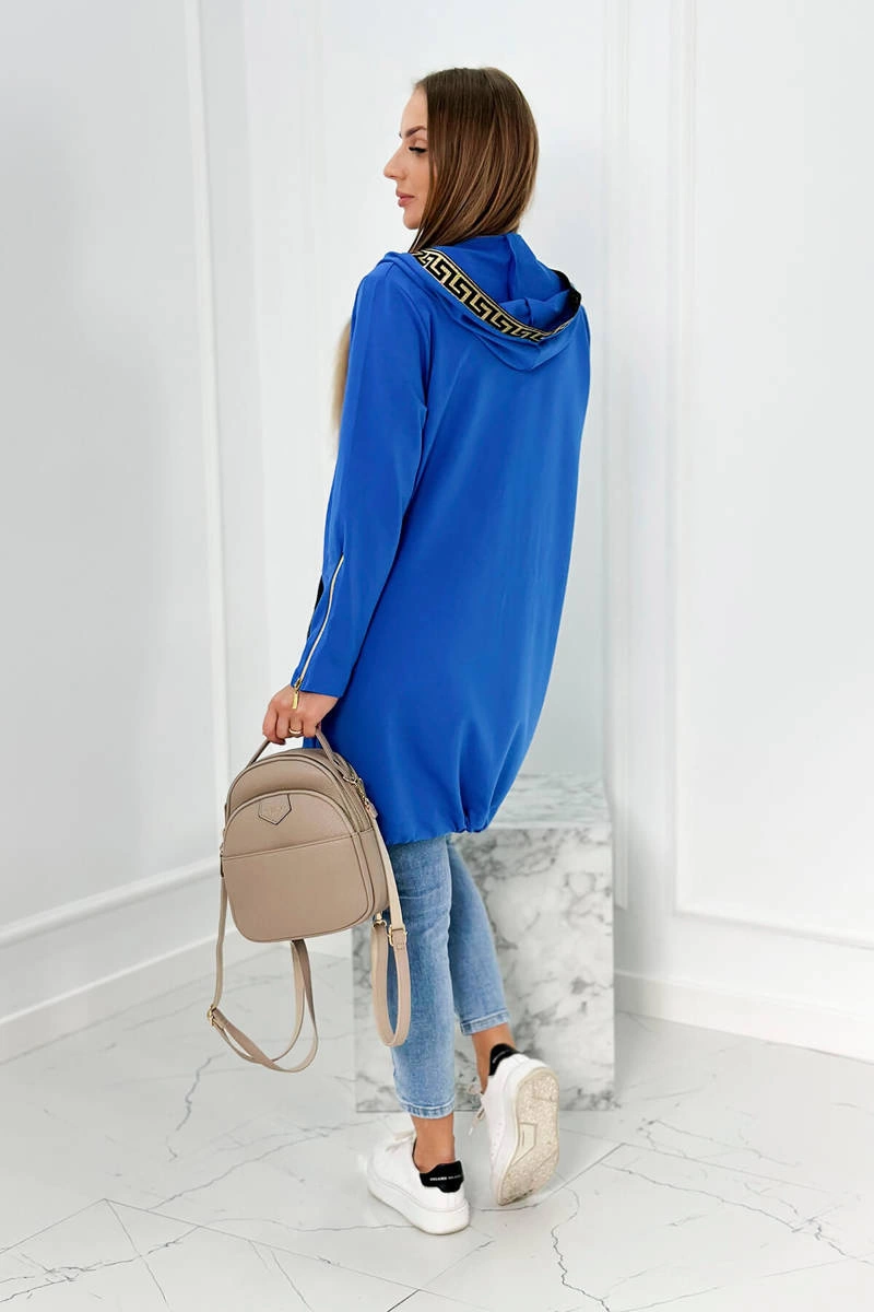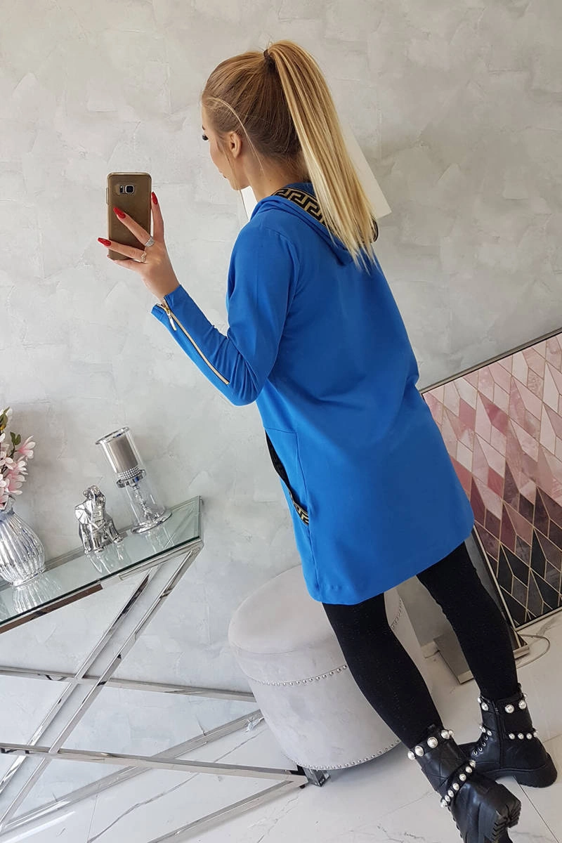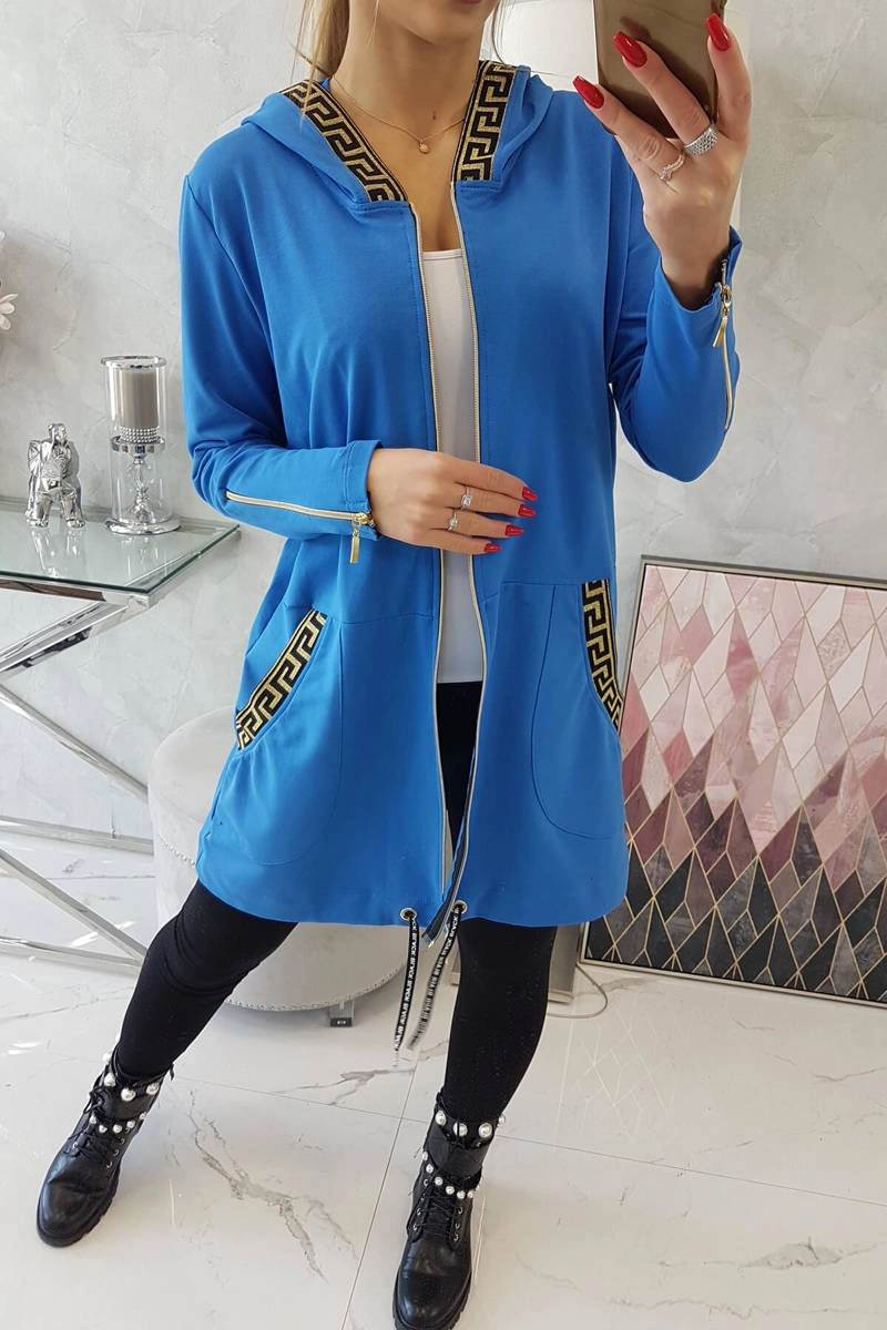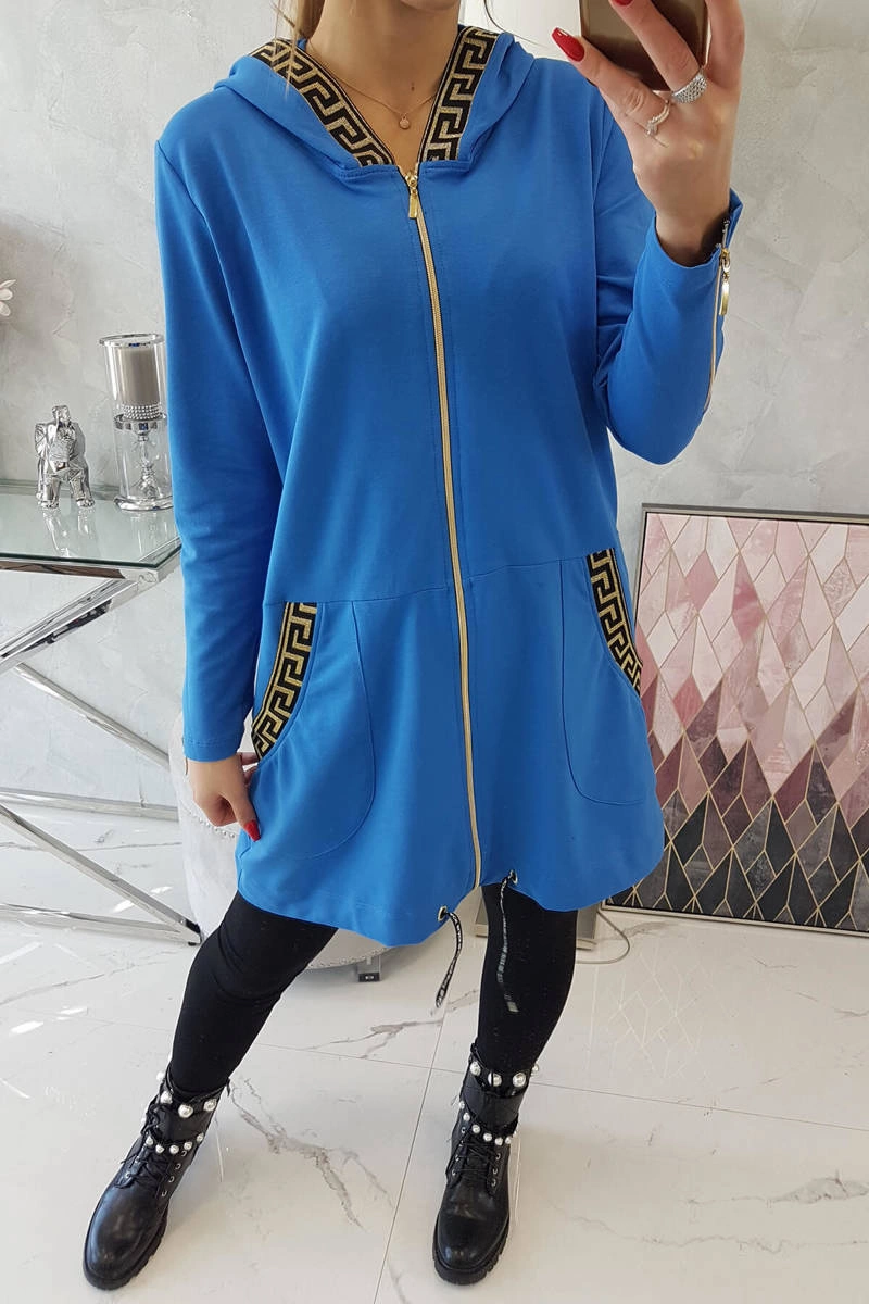We present you a comfortable long hoodie. The sweatshirt has a zipper closure and decorative tapes at the pockets and hood. The sweatshirt is made of high quality material. The size is universal and will be suitable for ladies wearing sizes S, M or L.