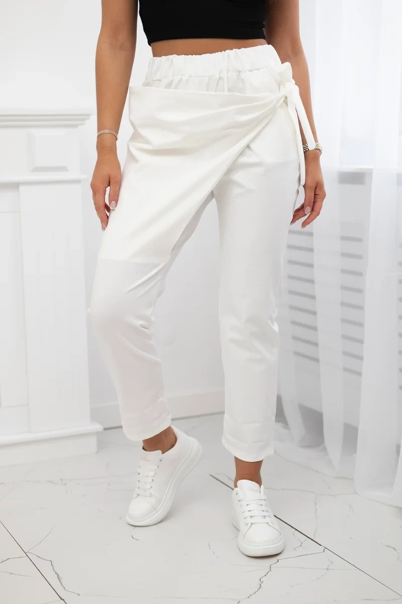 Tie-up trousers with an asymmetric front are a stylish and original piece of clothing that attracts attention due to its unusual detail. The asymmetric front adds character and modernity to the pants, giving them a unique design. The tie at the waist adds an additional decorative element and at the same time allows you to adjust the pants to your figure. This style of trousers can be worn both every day and for more special occasions. The asymmetric detail gives the trousers a modern and unconventional look, which makes them a perfect choice for people looking for fashionable solutions. Tie-up trousers with an asymmetric front are a perfect choice for people who want to stand out from the crowd and experiment with fashion. They can be combined with both a loose top for everyday use and a more elegant blouse for special occasions, creating unique and stylish combinations. The size is universal and will be suitable for women wearing size S, M or L.