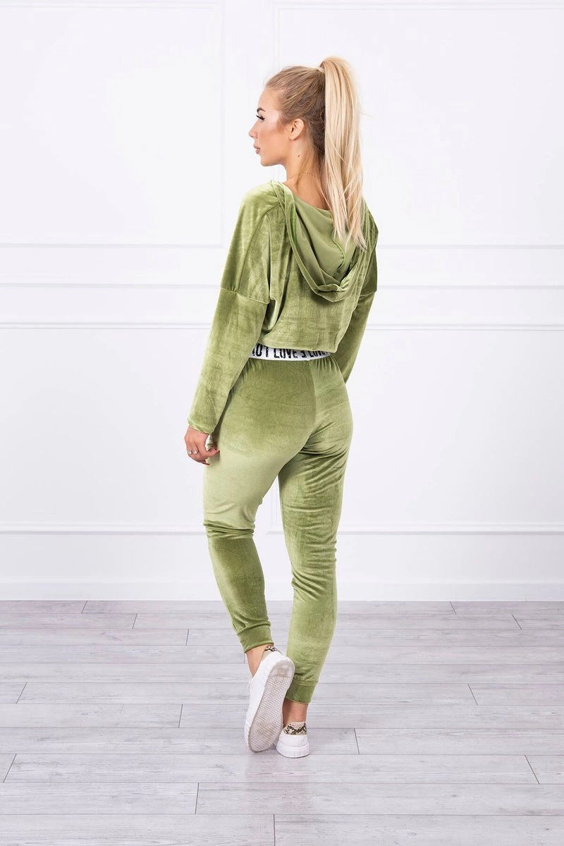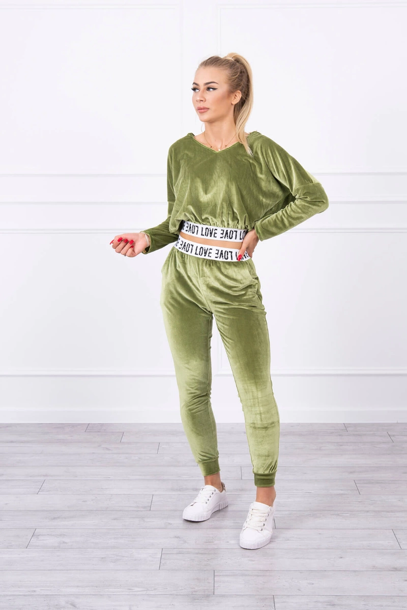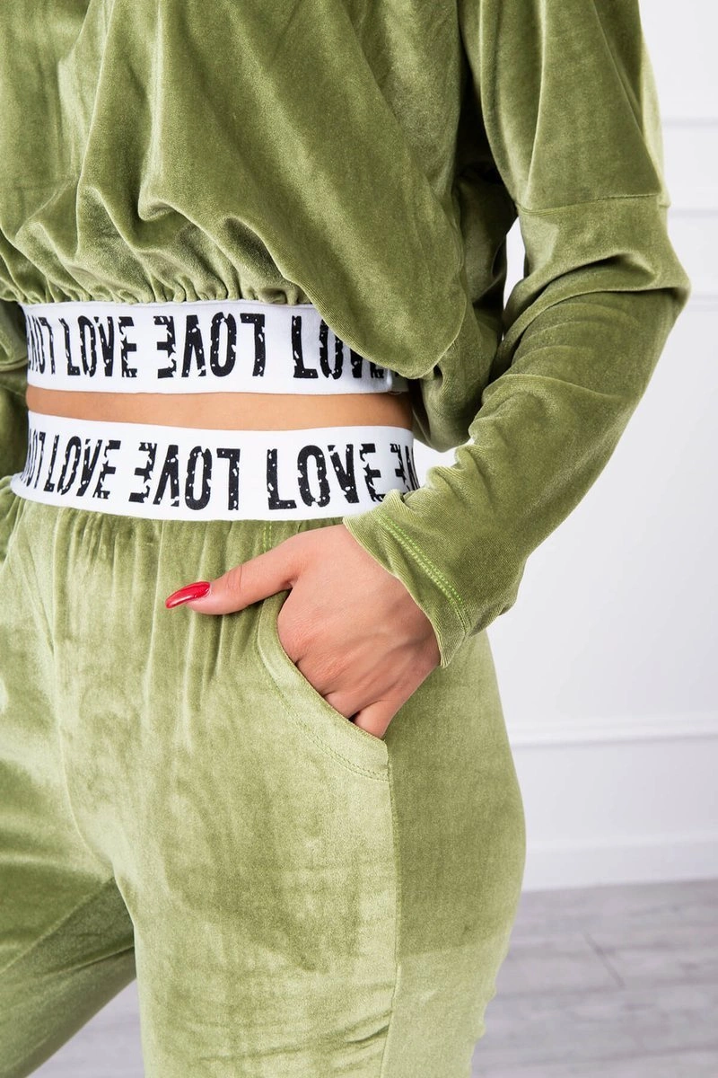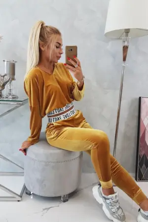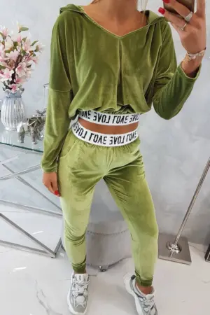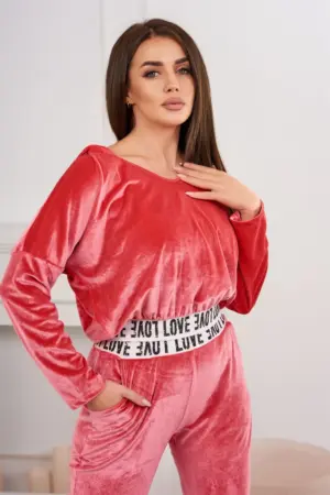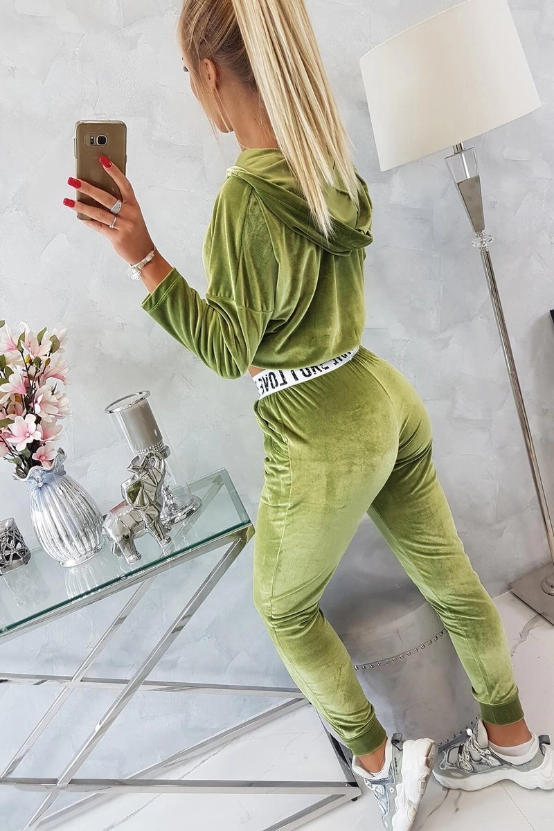 We present you a set of sweatshirts and pants. The set is made of velor. Sweatshirt with a hood and V-neckline. At the bottom of the sweatshirt there is a sewn-in tape with the inscription. Pants with pockets and a tape at the waist. The set is made of high quality material. The size is universal and will be suitable for ladies in sizes S, M or L.