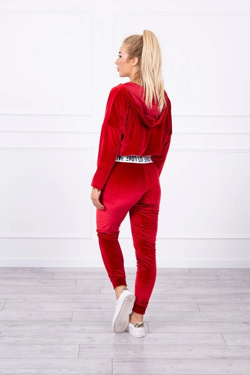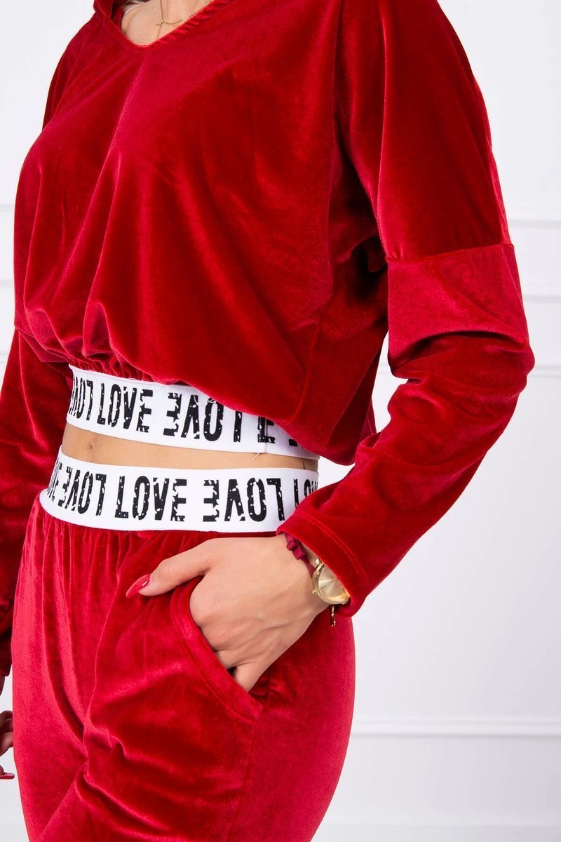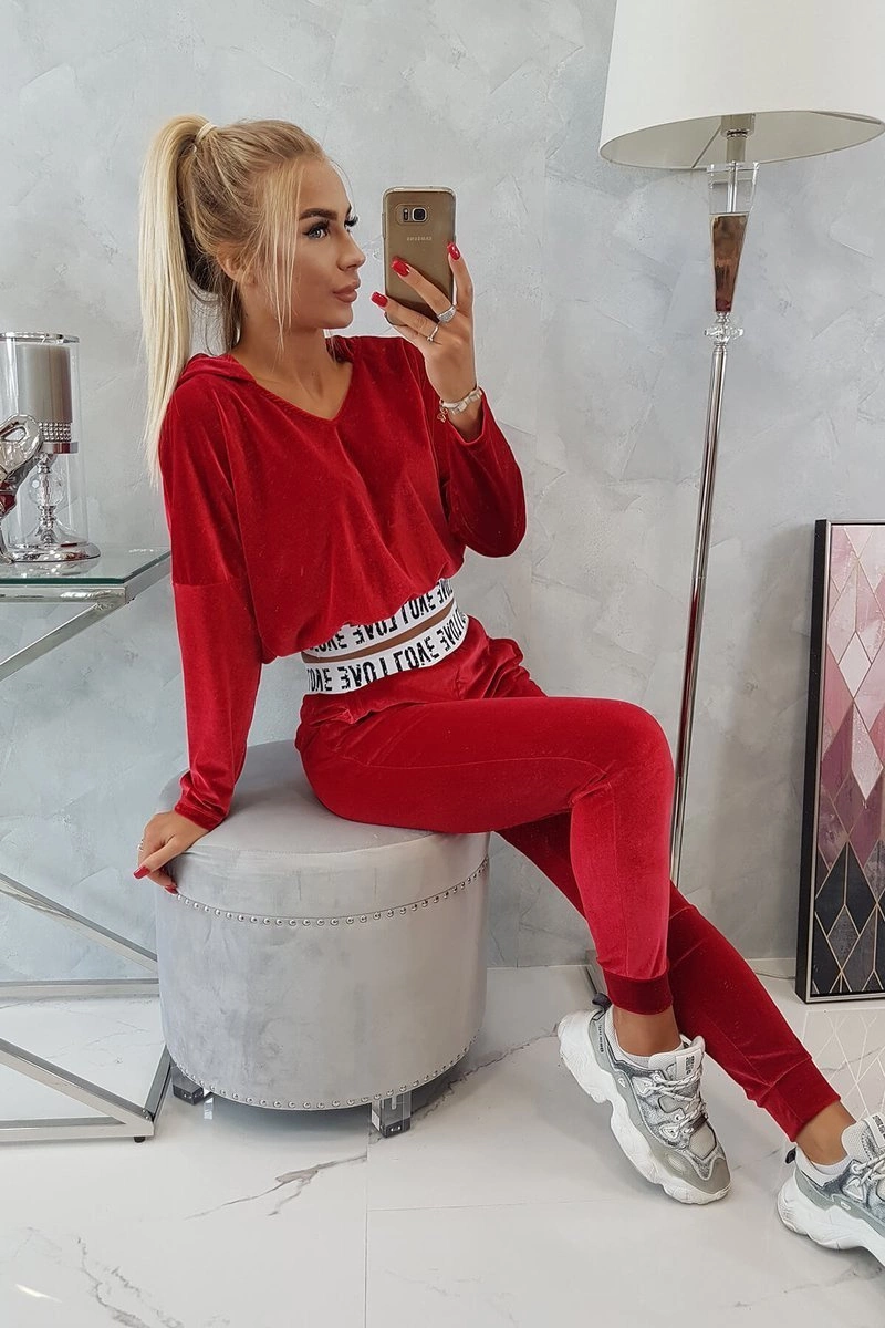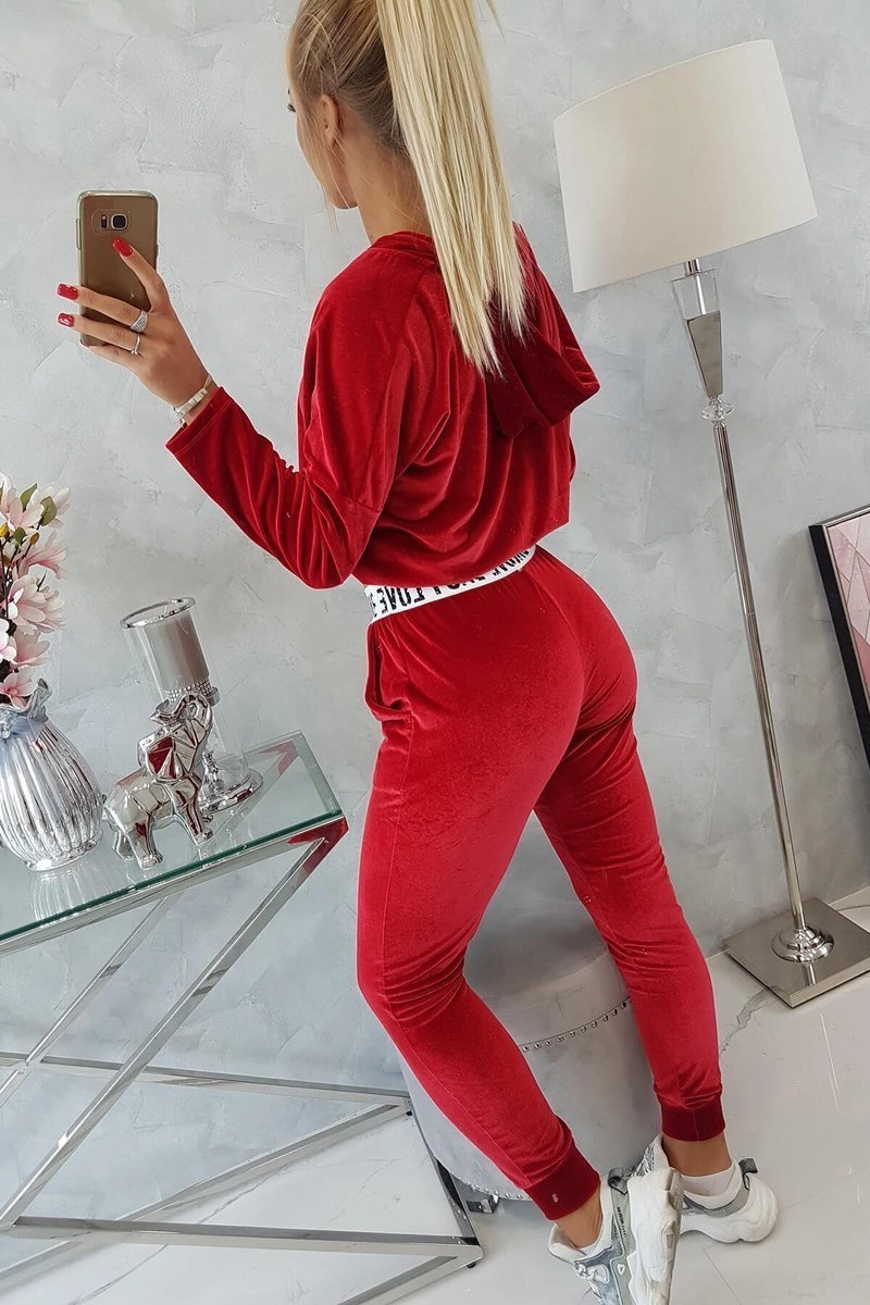 We present you a set of sweatshirts and pants. The set is made of velor. Sweatshirt with a hood and V-neckline. At the bottom of the sweatshirt there is a sewn-in tape with the inscription. Pants with pockets and a tape at the waist. The set is made of high quality material. The size is universal and will be suitable for ladies in sizes S, M or L.