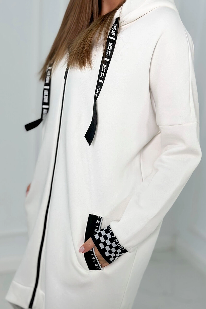 An extremely stylish zippered sweatshirt with a hood, perfect for colder days. Made of high-quality cotton, it guarantees not only comfort, but also durability and soft touch. The sweatshirt has a practical zipper that makes it easy to put on and take off, which makes it a perfect option for quick weather changes. The hood adds a unique character to the sweatshirt, giving it a youthful and modern look. Decorative cuffs on the sleeves and bottom of the sweatshirt give it a subtle accent, making it not only a practical but also a fashionable element of the wardrobe. This sweatshirt is the perfect combination of functionality and style, perfect for many occasions. Regardless of whether you are going for a walk, to school or to meet friends, this sweatshirt will certainly make you stand out from the crowd. Available in a variety of colors so you can match it to your individual style. Don’t wait – emphasize your fashion awareness with our sweatshirt. The size is universal and will be suitable for women wearing size S, M or L.